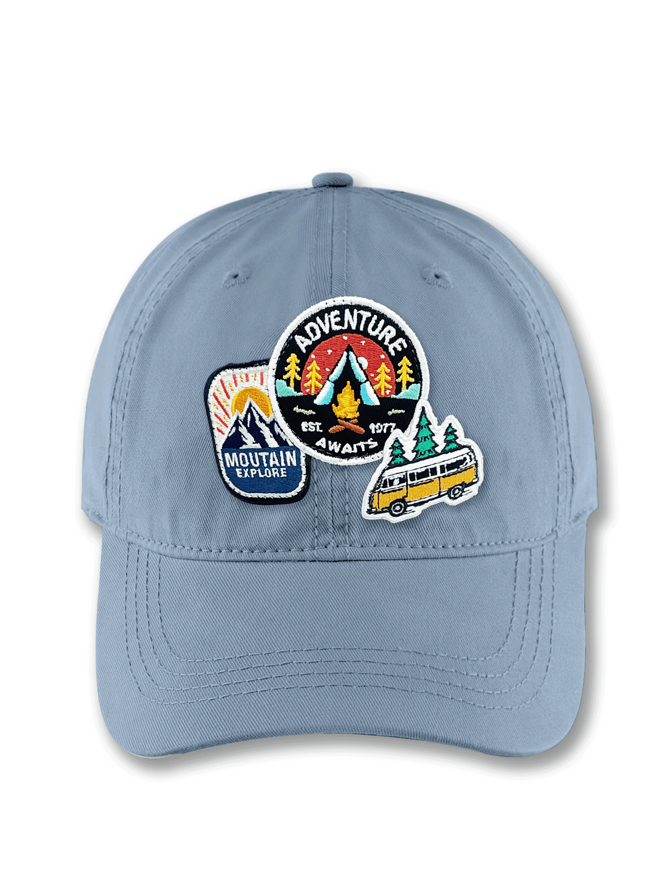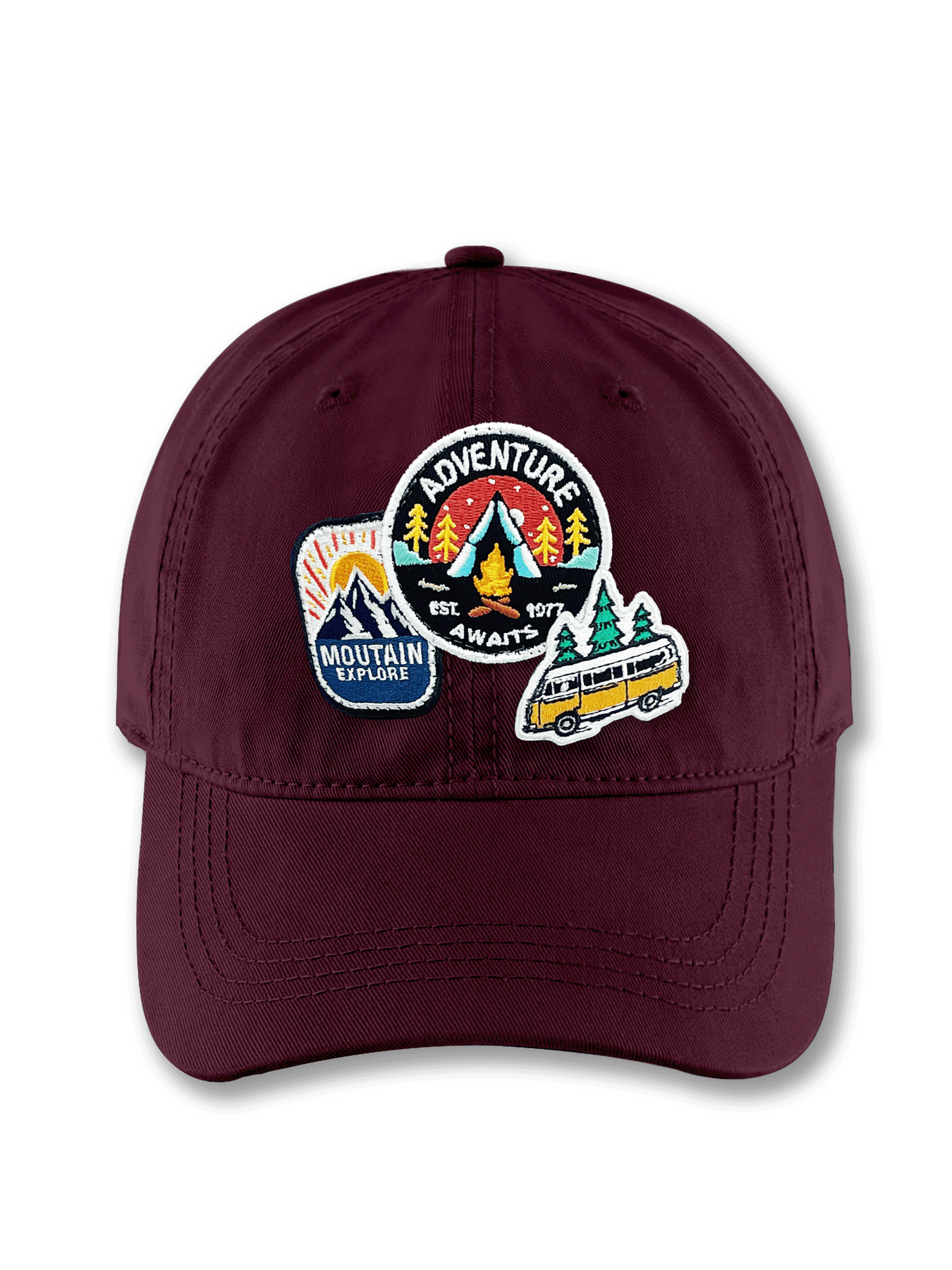 Adventure is calling with this Adventure Awaits Embroidered Patch Baseball Cap. Inspired by the spirit of exploration and the joy of the great outdoors, this cap features three vibrant embroidered patches — a circular badge with “Adventure Awaits” and a glowing campfire under a starry night, a scenic “Mountain Explore” patch, and a yellow camper van surrounded by pine trees. Each element tells a story of wanderlust, freedom, and the love of nature.