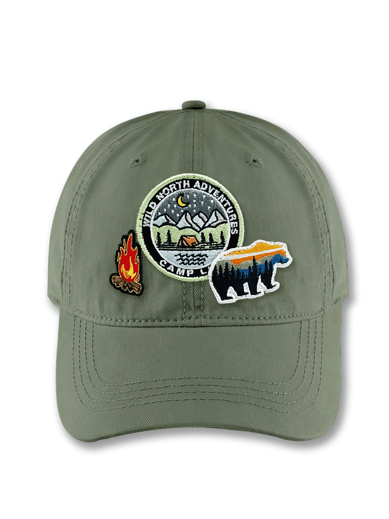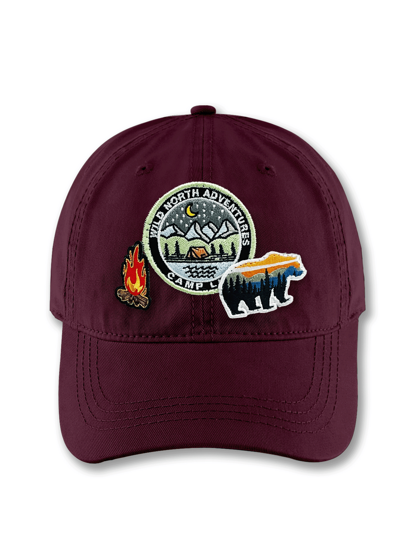 Embrace the call of the wild with this Wild North Adventures Baseball Cap — a tribute to outdoor exploration and rugged wilderness spirit. The earthy brown cap features detailed embroidered patches of a mountain campsite under the night sky, a glowing campfire, and a striking bear silhouette filled with forest colors. Each design element captures the essence of adventure, freedom, and connection with nature.