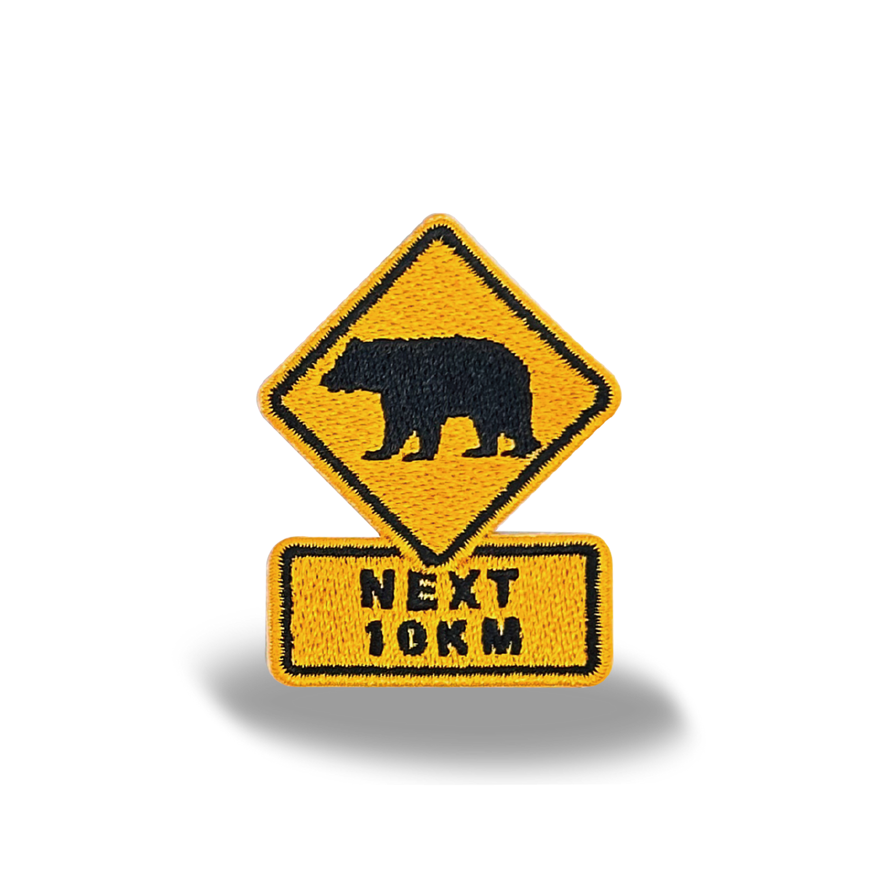 This embroidered patch takes inspiration from classic wildlife road signs, featuring a bold bear silhouette and the text “NEXT 10KM.” The bright yellow background with a diamond-shaped design ensures high visibility, while the playful concept makes it a fun accessory for jackets, backpacks, or outdoor gear. It’s a perfect patch for those who love adventure and the thrill of spotting wildlife in the great outdoors.