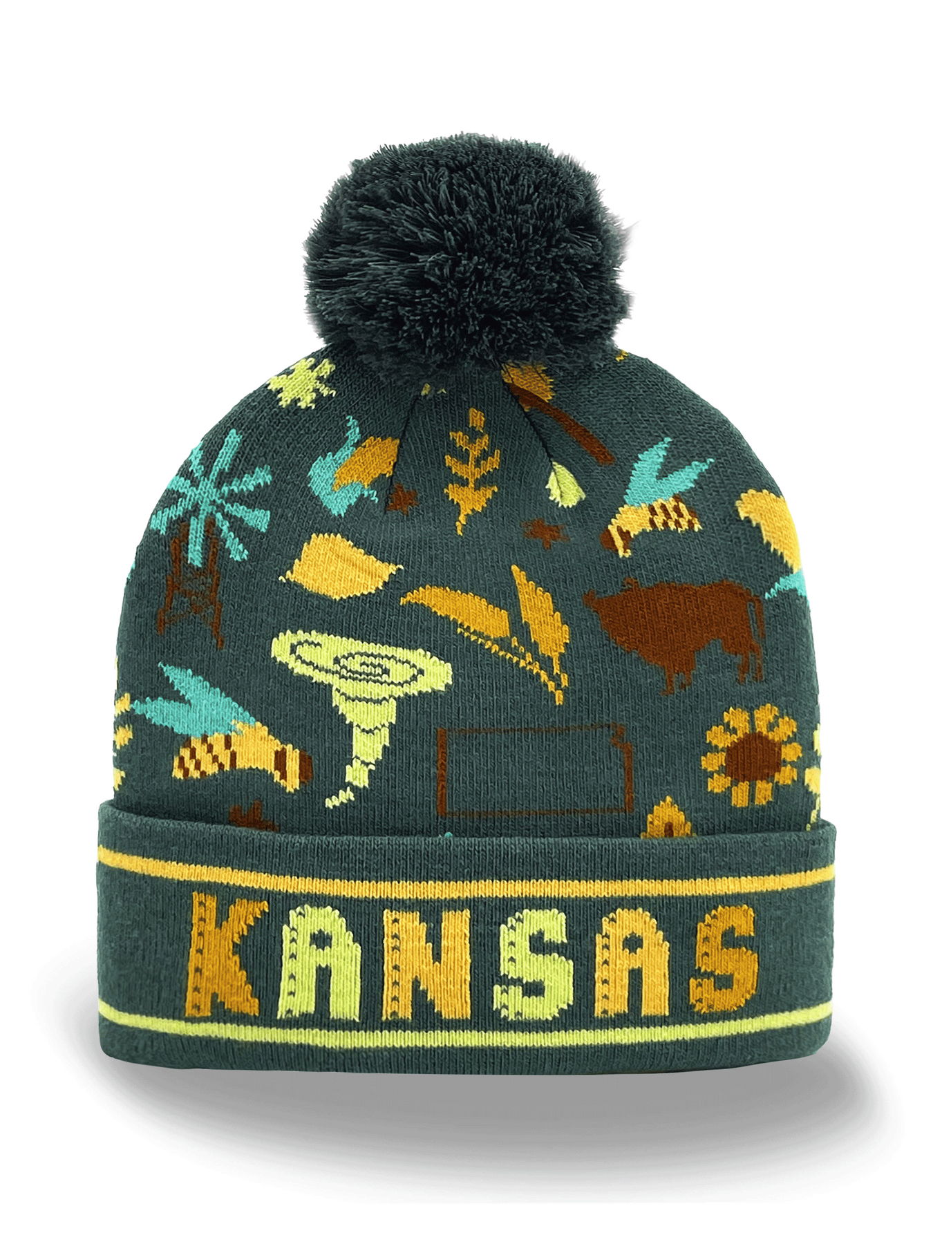 Celebrate the heartland of America with this Kansas Knit Beanie Hat with Bison Bee Tornado Sunflower Pattern Winter Pom Pom Cap. This deep green beanie brings the spirit of the Sunflower State to life with iconic illustrations of bison, bees, sunflowers, prairie grass, wheat, tornadoes, and the Kansas state outline. The bold “KANSAS” lettering across the fold-over cuff and the fluffy pom pom on top add a touch of warmth and personality.