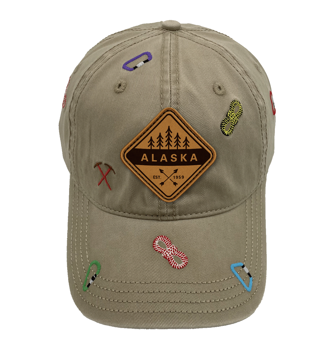 🧗 Embroidered Climbing Icons – carabiners, climbing ropes, and ice axes celebrating Alaska’s alpine adventure culture