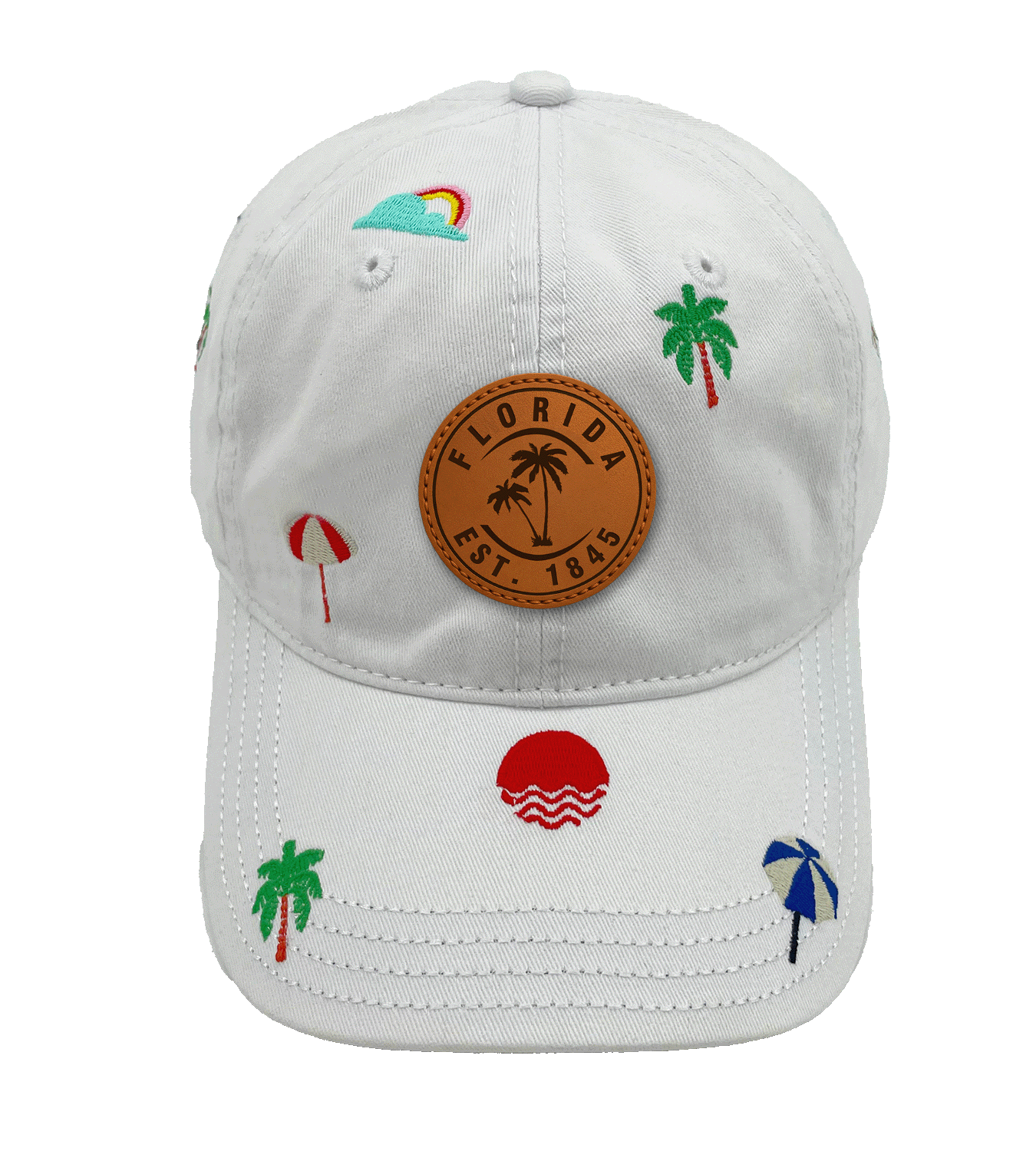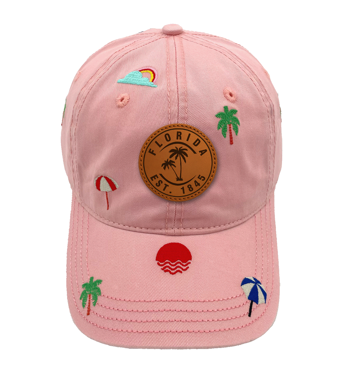 Add a touch of tropical sunshine with the Florida Tropical Beach Baseball Cap,. Inspired by Florida’s iconic beaches and vibrant coastal lifestyle, the design features embroidered details such as palm trees, colorful umbrellas, a radiant sunset, and a rainbow peeking from the clouds. The central faux-leather patch highlights “FLORIDA EST. 1845,” celebrating the state’s heritage and timeless coastal spirit. The cap’s fresh, beach-inspired base color enhances the lively theme, making it a versatile accessory for both seaside adventures and everyday wear. Perfect for travelers, outdoor lovers, and those who embrace a sun-soaked, coastal lifestyle.