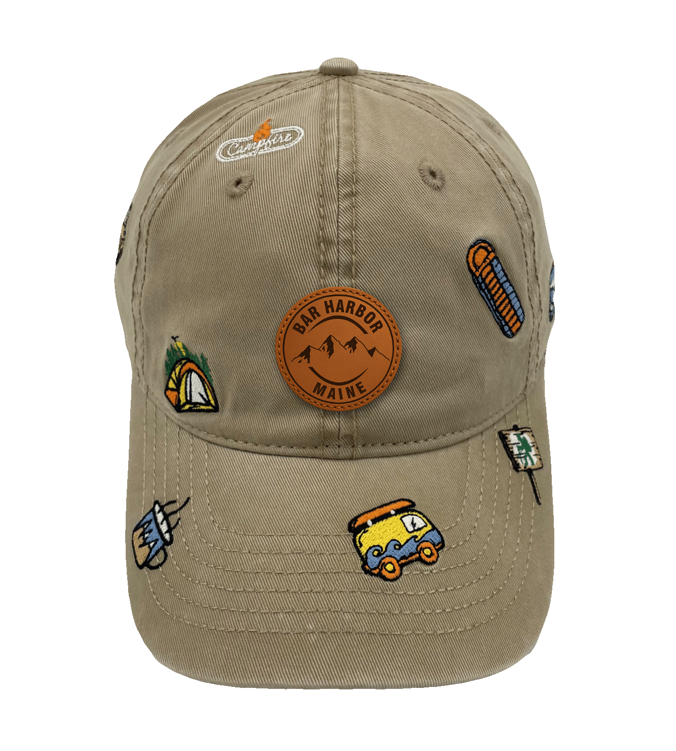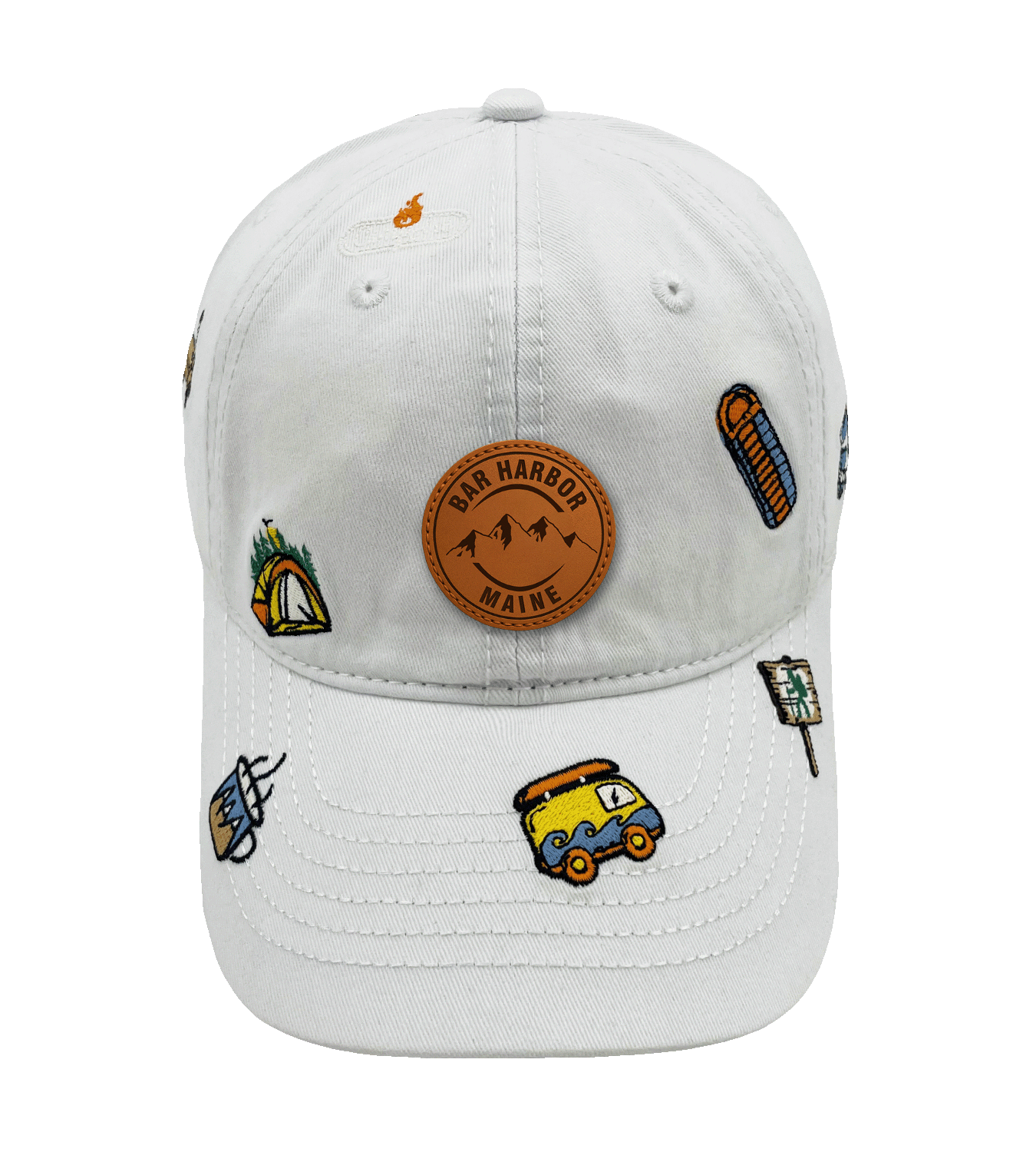 A perfect souvenir for outdoor enthusiasts and park visitors, this explorer cap features playful embroidered elements like a camper van, tent, and trail sign, capturing the adventurous spirit of Acadia National Park in Maine.