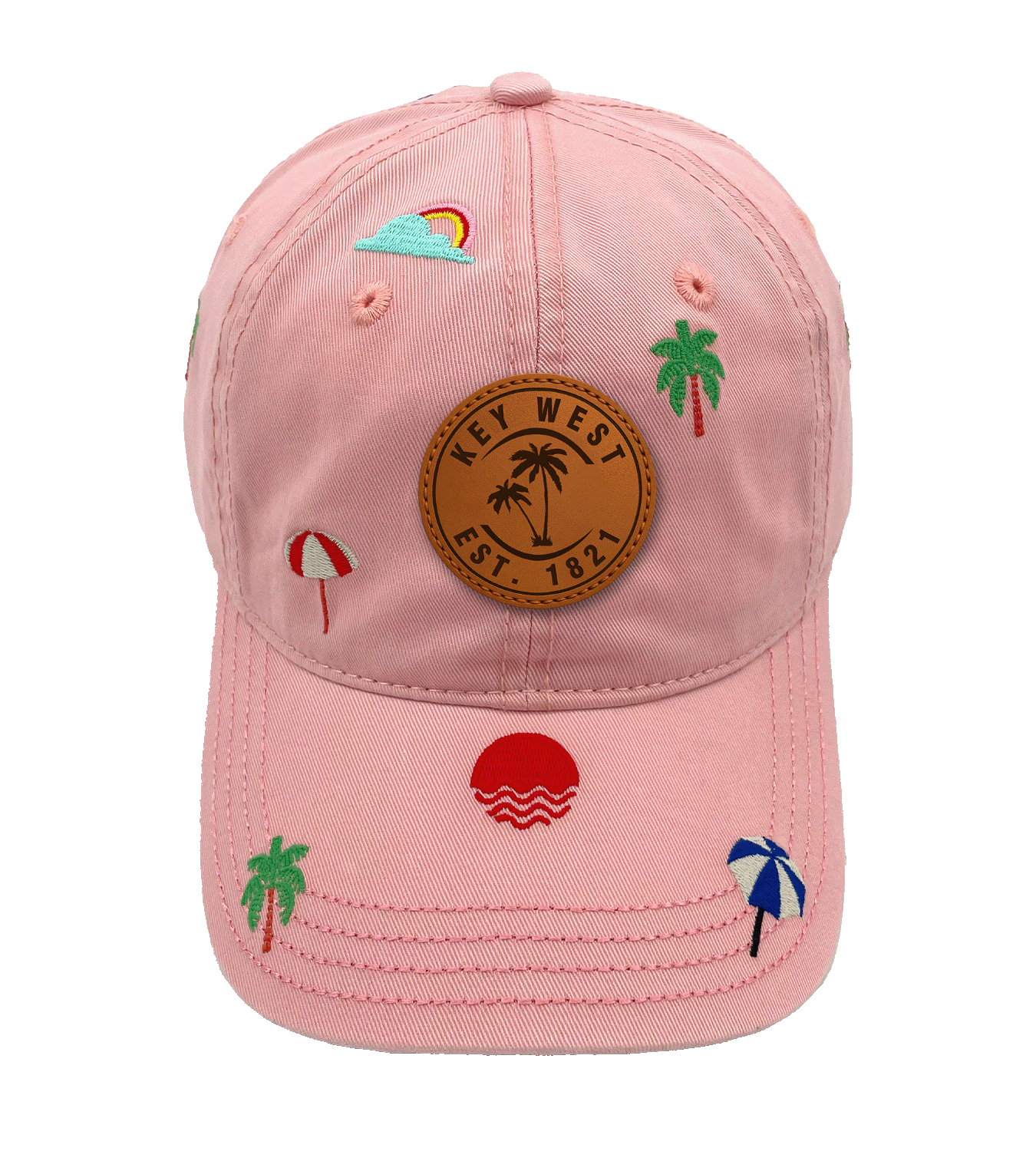 Add a touch of island charm with the Key West Florida Coastal Vibes Baseball Cap. Inspired by the tropical vibes of Florida’s southernmost island, the design features embroidered details such as palm trees, colorful umbrellas, a radiant sunset, and a rainbow peeking from the clouds. The central faux-leather patch highlights “KEY WEST EST. 1821,” celebrating the island’s heritage and its laid-back coastal spirit. The cap’s fresh, beach-inspired base color enhances the tropical theme, making it a versatile accessory for both seaside adventures and everyday wear. Perfect for travelers, outdoor lovers, and those who embrace a sun-soaked lifestyle.