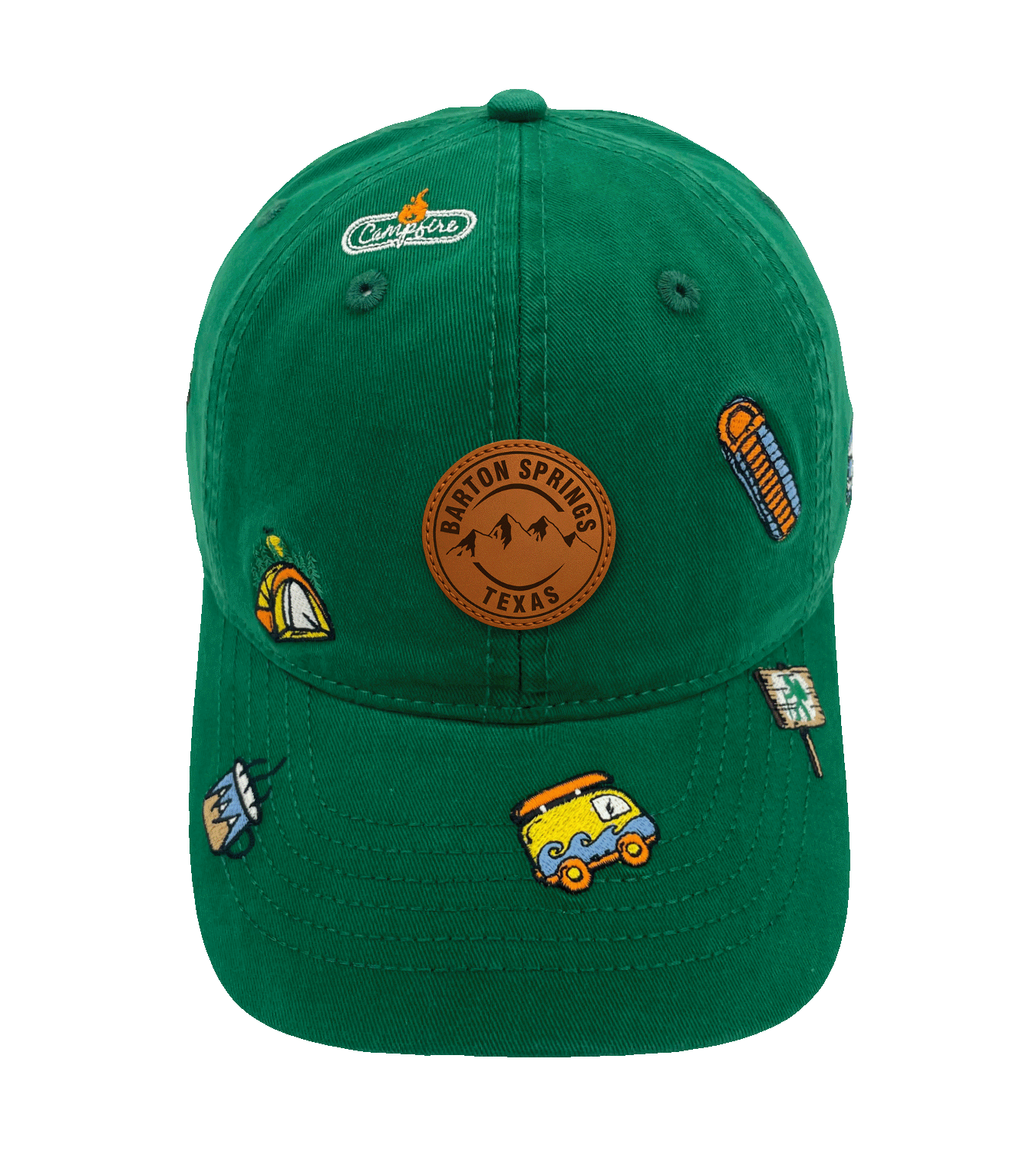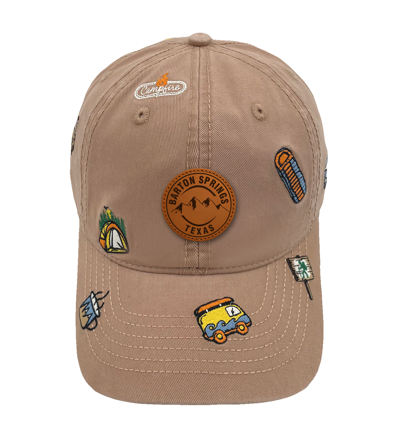 A fun and thoughtful gift for tourists and adventurers, this cap features embroidered travel icons like a camper van, tent, and hiking sign — reflecting the spirit of exploration in San Antonio, Texas.