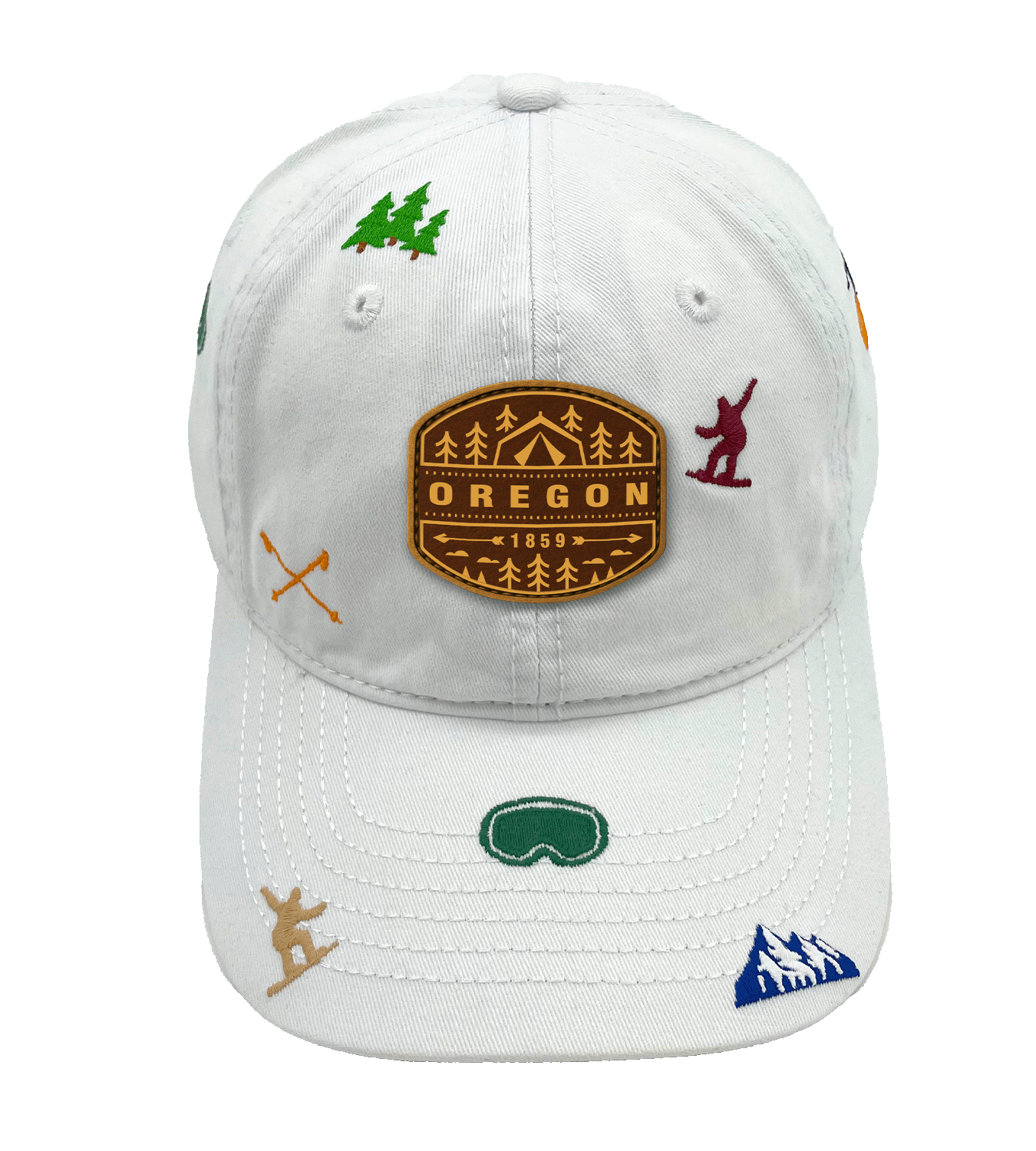 Add a touch of alpine adventure with the Oregon Ski Adventure Baseball Cap. Inspired by Oregon’s rugged Cascade Range and outdoor lifestyle, the design features embroidered details such as skiers, snow-capped peaks, goggles, pine trees, and crossed ski poles. The central faux-leather patch highlights “OREGON 1859,” celebrating the state’s heritage and deep connection to mountain exploration. The rich base color enhances the alpine theme, making it a versatile accessory for winter sports and casual wear. Perfect for outdoor enthusiasts, travelers, and anyone who loves mountain-inspired style.