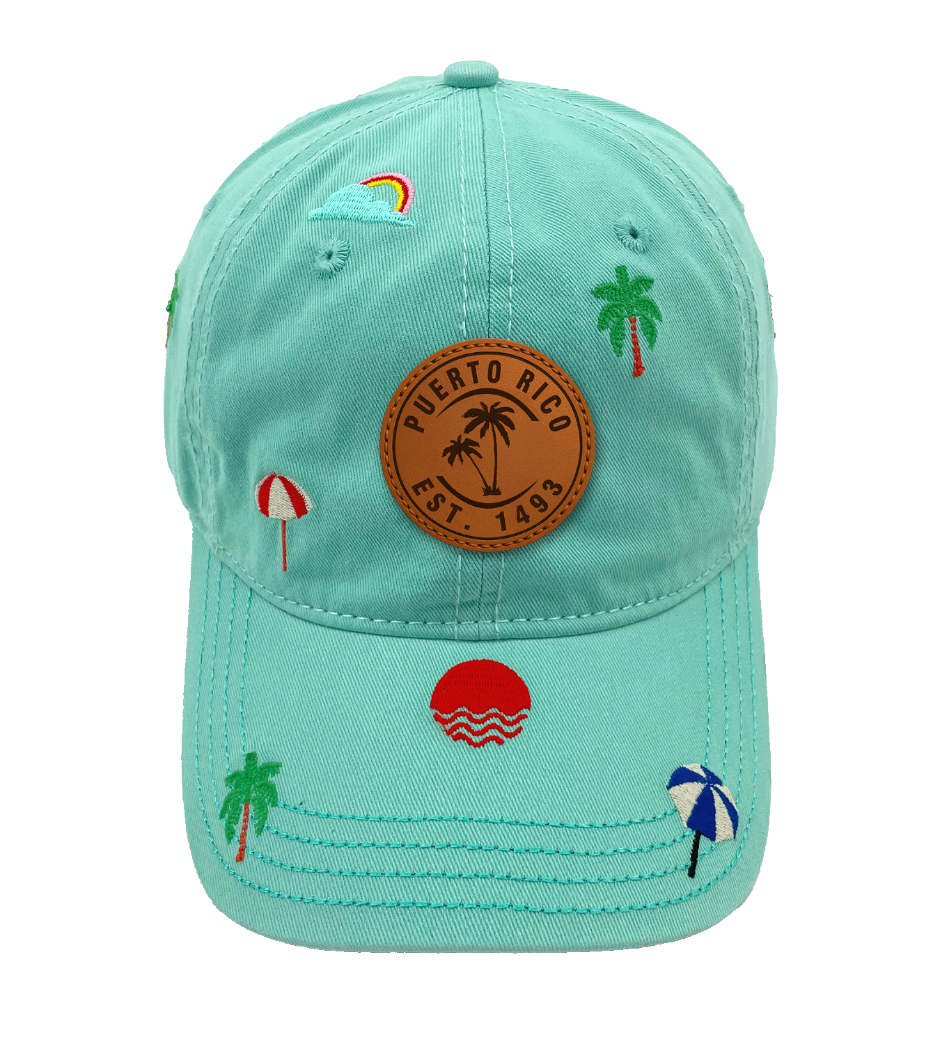 Add a touch of island charm with the Puerto Rico Tropical Beach Baseball Cap. Inspired by the vibrant tropical spirit of the Caribbean, the design features embroidered details such as palm trees, colorful umbrellas, a radiant sunset, and a rainbow peeking from the clouds. The central faux-leather patch highlights “PUERTO RICO EST. 1493,” celebrating the island’s heritage and its relaxed coastal lifestyle. The cap’s fresh, beach-inspired base color enhances the tropical theme, making it a versatile accessory for both seaside adventures and everyday wear. Perfect for travelers, outdoor lovers, and those who embrace a sun-soaked lifestyle.