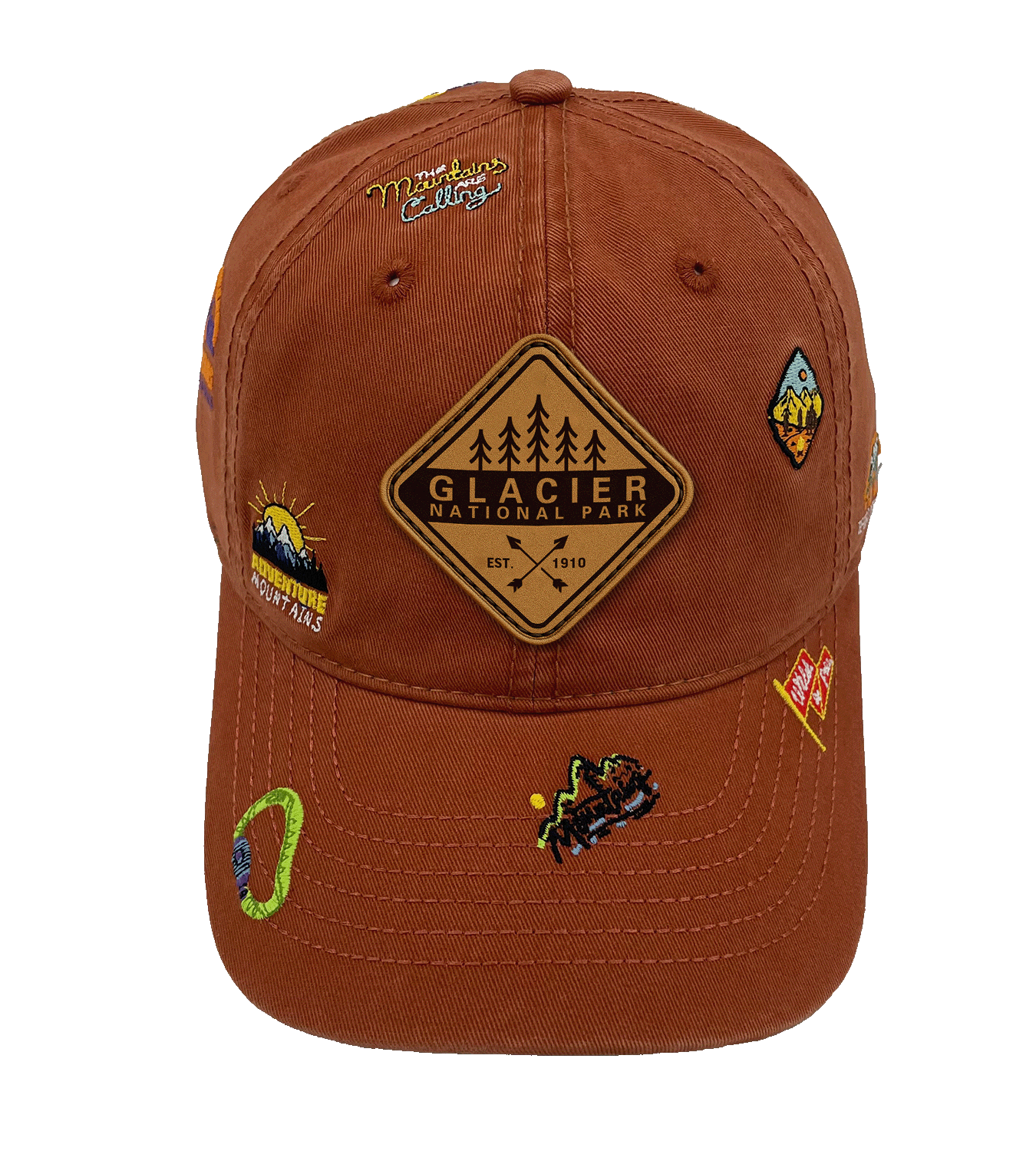 This Glacier-themed cap captures the essence of mountain adventure with bold embroidered patches and a rugged outdoor vibe. Ideal for national park stores, adventure outfitters, and souvenir retailers.