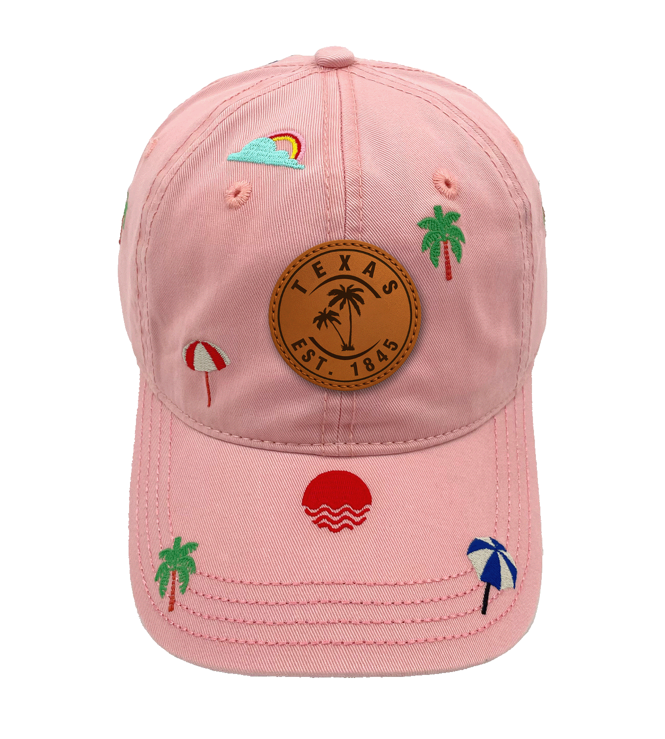 Add a touch of southern adventure with the Texas Tropical Beach Baseball Cap. Inspired by the Lone Star State’s vibrant spirit, the design features embroidered details such as palm trees, colorful umbrellas, a radiant sunset, and a rainbow peeking from the clouds. The central faux-leather patch highlights “TEXAS EST. 1845,” celebrating the state’s history and unique character. The cap’s fresh, beach-inspired base color enhances the playful theme, making it a versatile accessory for both road trips and everyday wear. Perfect for travelers, outdoor lovers, and those who embrace a sun-soaked lifestyle.