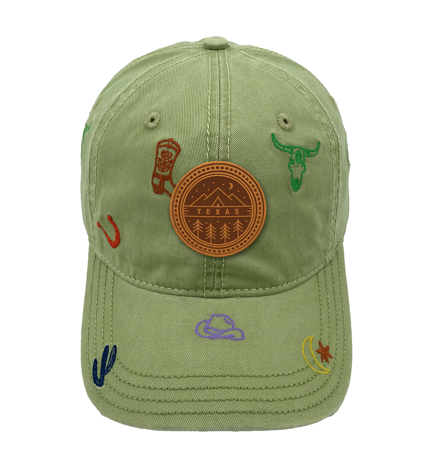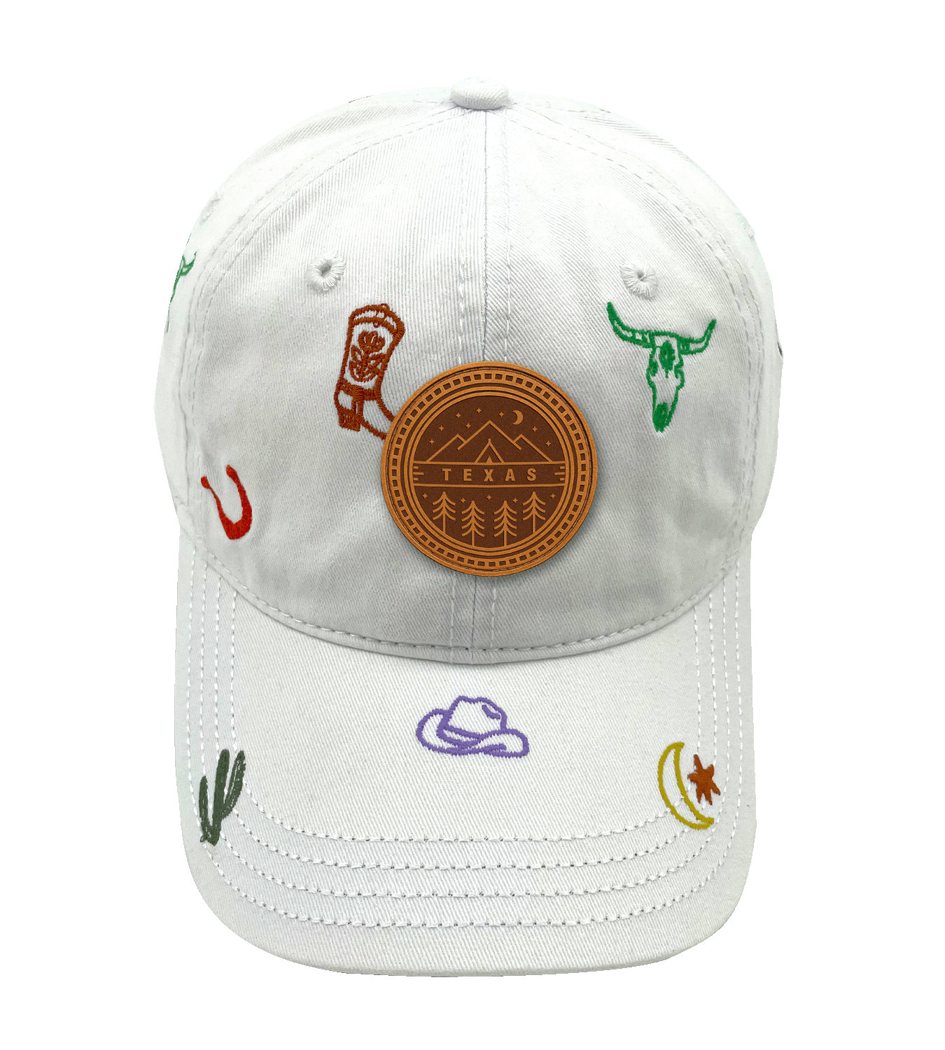 Add a touch of western charm with the Texas Cowboy Adventure Baseball Cap. Inspired by the Lone Star State’s cowboy heritage and rugged landscapes, the design features embroidered details such as a cowboy boot, steer skull, cactus, horseshoe, cowboy hat, and desert star. The central faux-leather patch highlights “TEXAS” with mountain and pine silhouettes, paying tribute to the state’s spirit of freedom and outdoor tradition. The cap’s bright base color enhances the bold cowboy theme, making it a versatile accessory for ranch life, desert trips, and everyday wear. Perfect for travelers, outdoor lovers, and those who embrace the cowboy lifestyle.