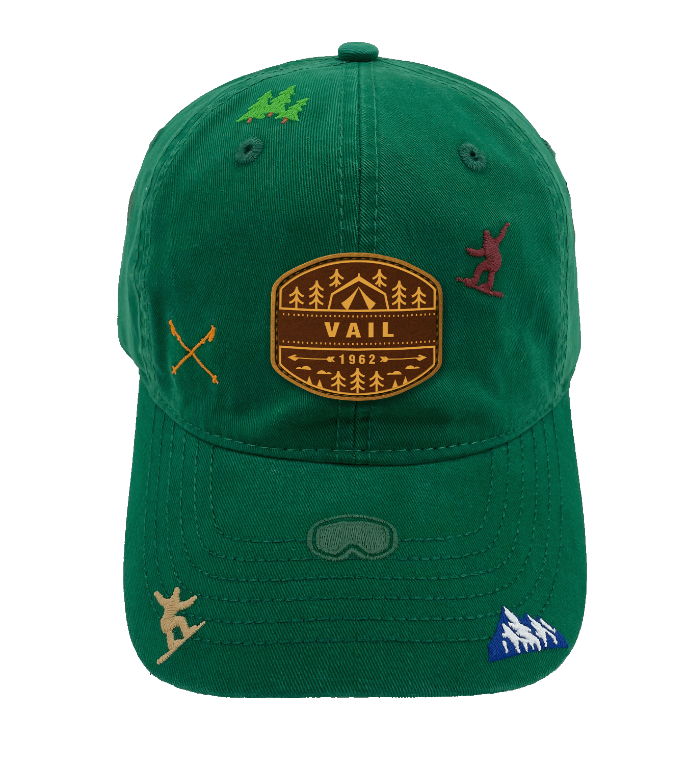 Add a touch of alpine adventure with the Vail Ski Adventure Baseball Cap. Inspired by Colorado’s iconic Vail Mountain and its celebrated ski culture, the design showcases embroidered details such as skiers, snow-capped peaks, goggles, pine trees, and crossed ski poles. The central faux-leather patch highlights “VAIL 1962,” paying tribute to the town’s heritage and deep connection to mountain exploration. The rich and dynamic base color enhances the alpine theme, making it a versatile accessory for both winter sports and everyday wear. Perfect for outdoor enthusiasts, travelers, and those who embrace a mountain-inspired lifestyle.