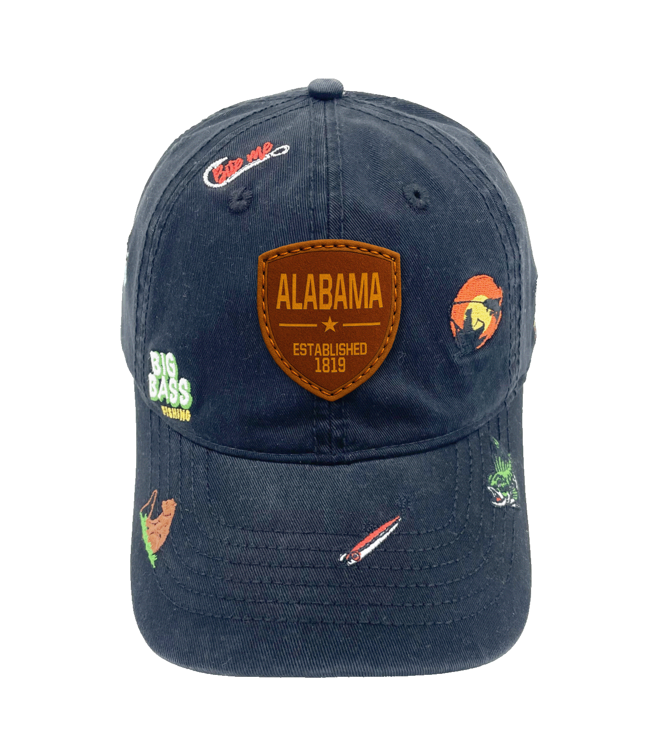 🎣 Fishing-Inspired Design – Features detailed embroidery of bass, lures, hooks, and fishing scenes that highlight Alabama’s angling traditions