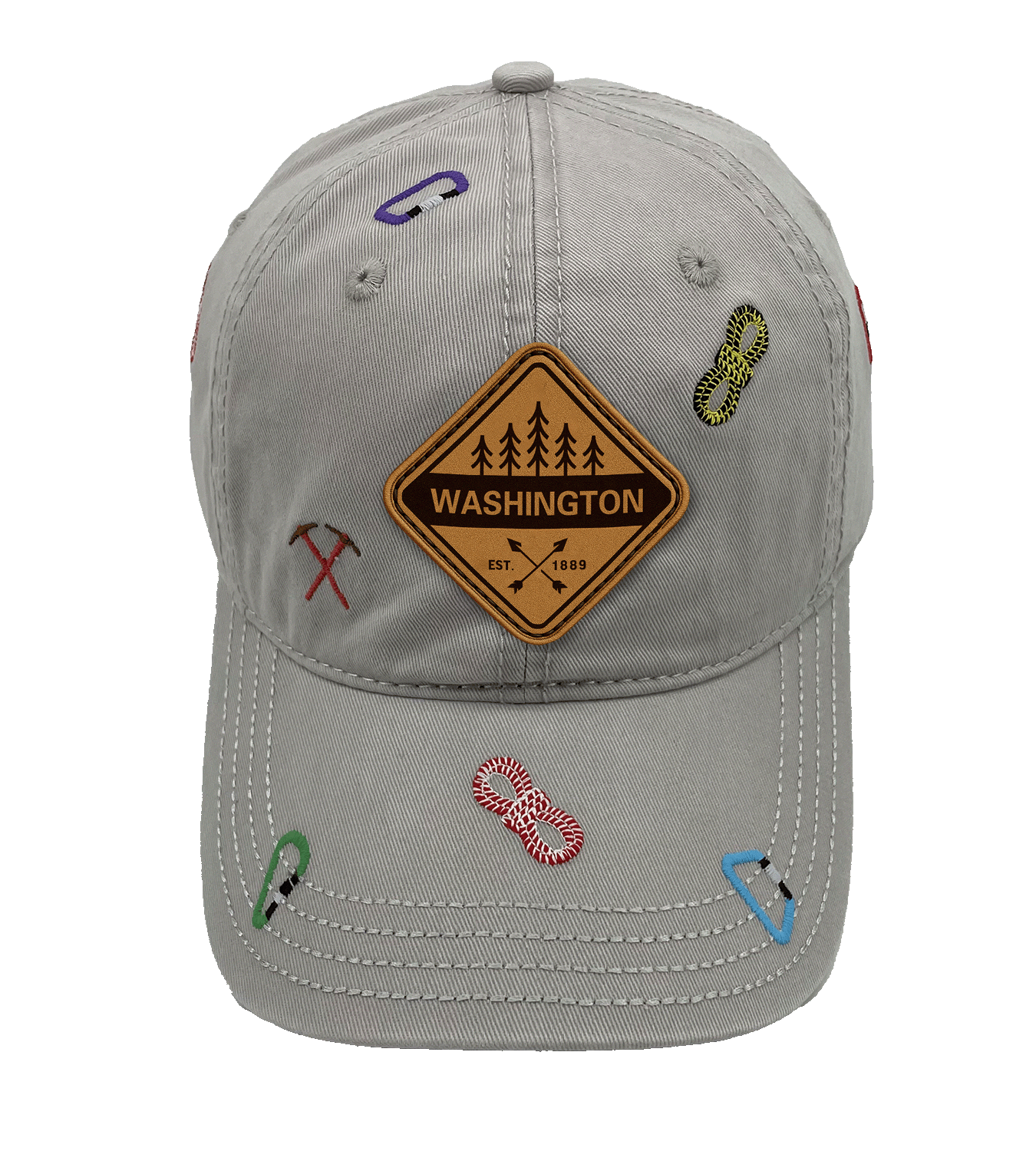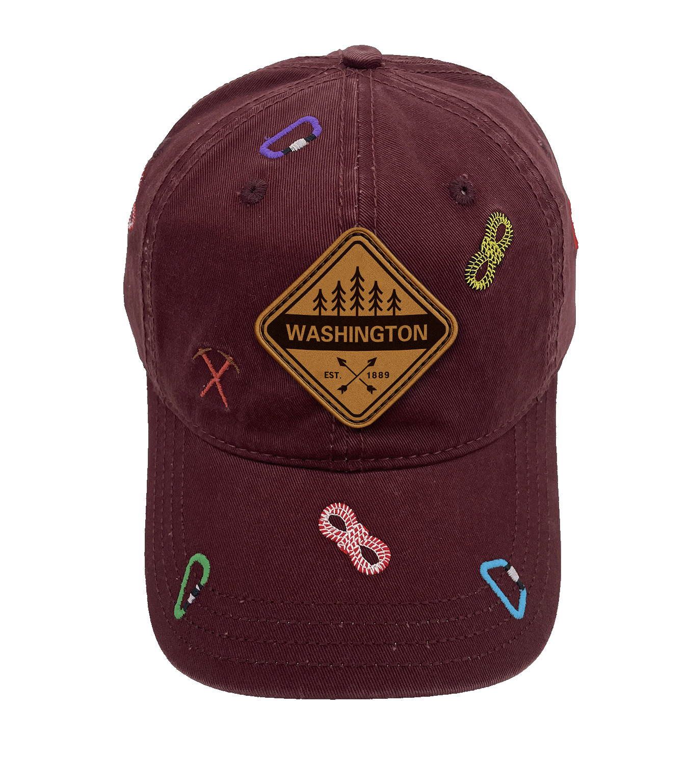 Celebrate outdoor adventure with this Washington Baseball Cap, a perfect blend of style and function. The cap features an embroidered patch with pine trees, mountains, and crossed axes, symbolizing the rugged beauty and adventurous spirit of Washington. Accented with colorful climbing rope and carabiner motifs. Durable stitching enhances the overall look, making it both fashionable and practical.