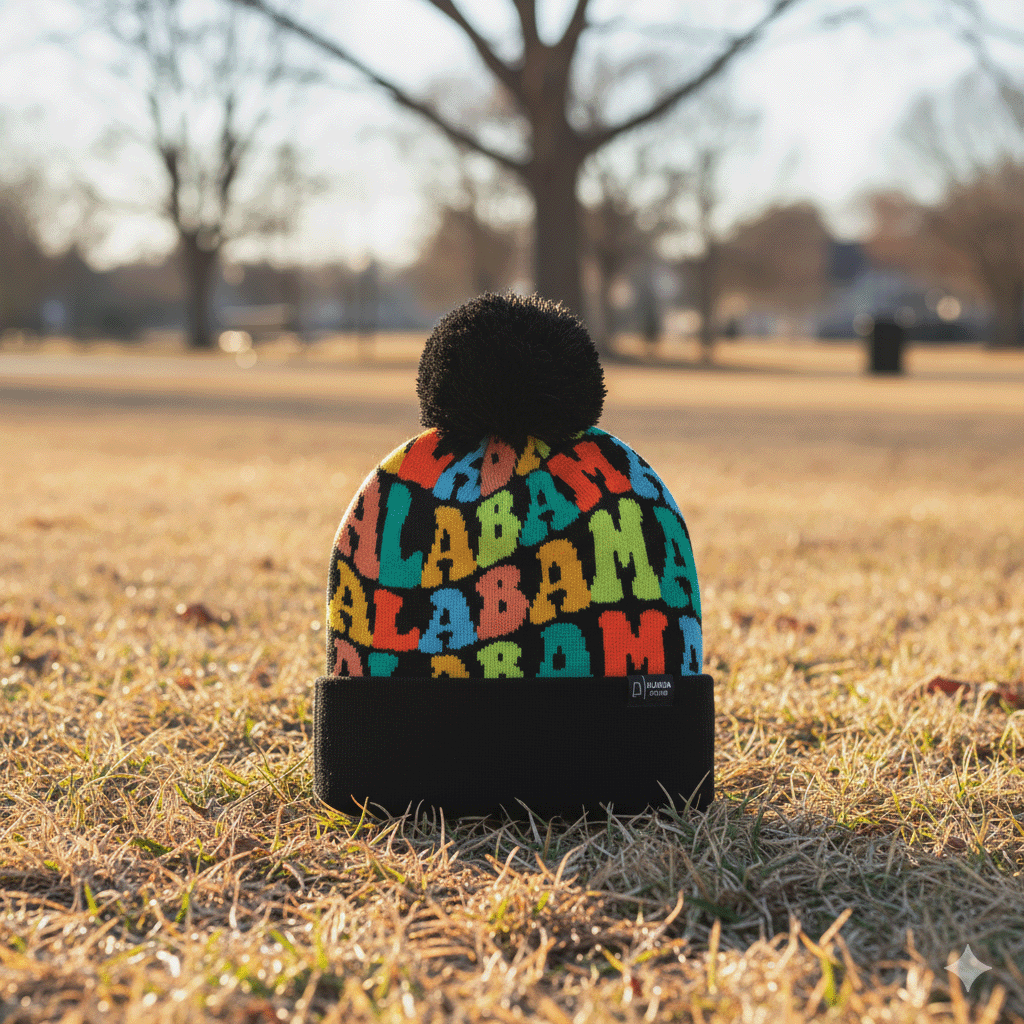 Bring bold personality and southern spirit to your winter look with this ALABAMA Colorful Knit Beanie with Pom Pom. The design celebrates the lively energy of Alabama through oversized retro-style typography in bright, contrasting colors. Each letter pops against the deep navy background, creating a fun, nostalgic pattern that captures both warmth and character. The playful pom pom on top adds a cozy finish, making this beanie as stylish as it is cheerful.