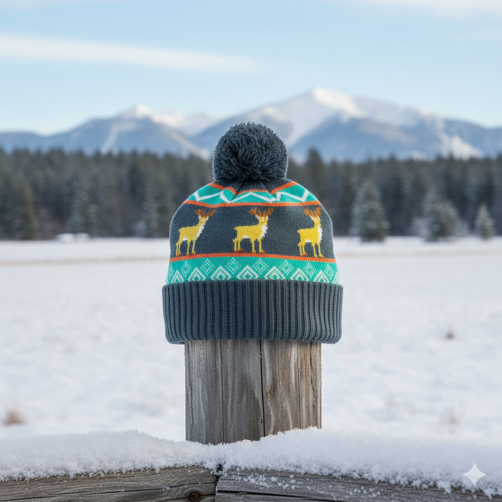 Bring a cheerful touch of winter style to your cold-weather wardrobe with this Deer Winter Knit Beanie. Inspired by Nordic geometric motifs and bright seasonal colors, the design features a row of woven deer silhouettes, blending classic winter storytelling with a modern outdoor aesthetic. The vivid turquoise, orange, and white accents create a lively contrast, giving the beanie a warm, festive personality.
