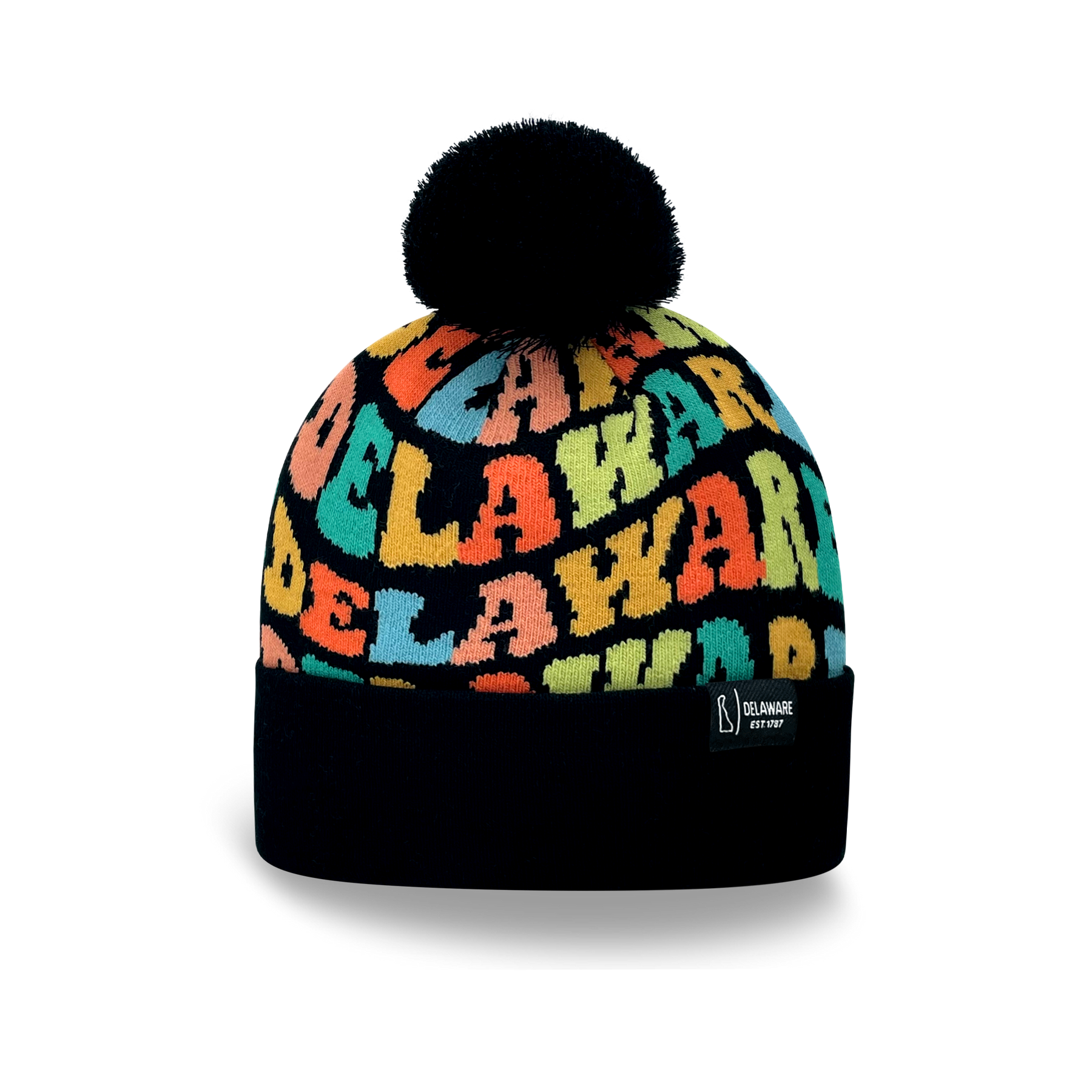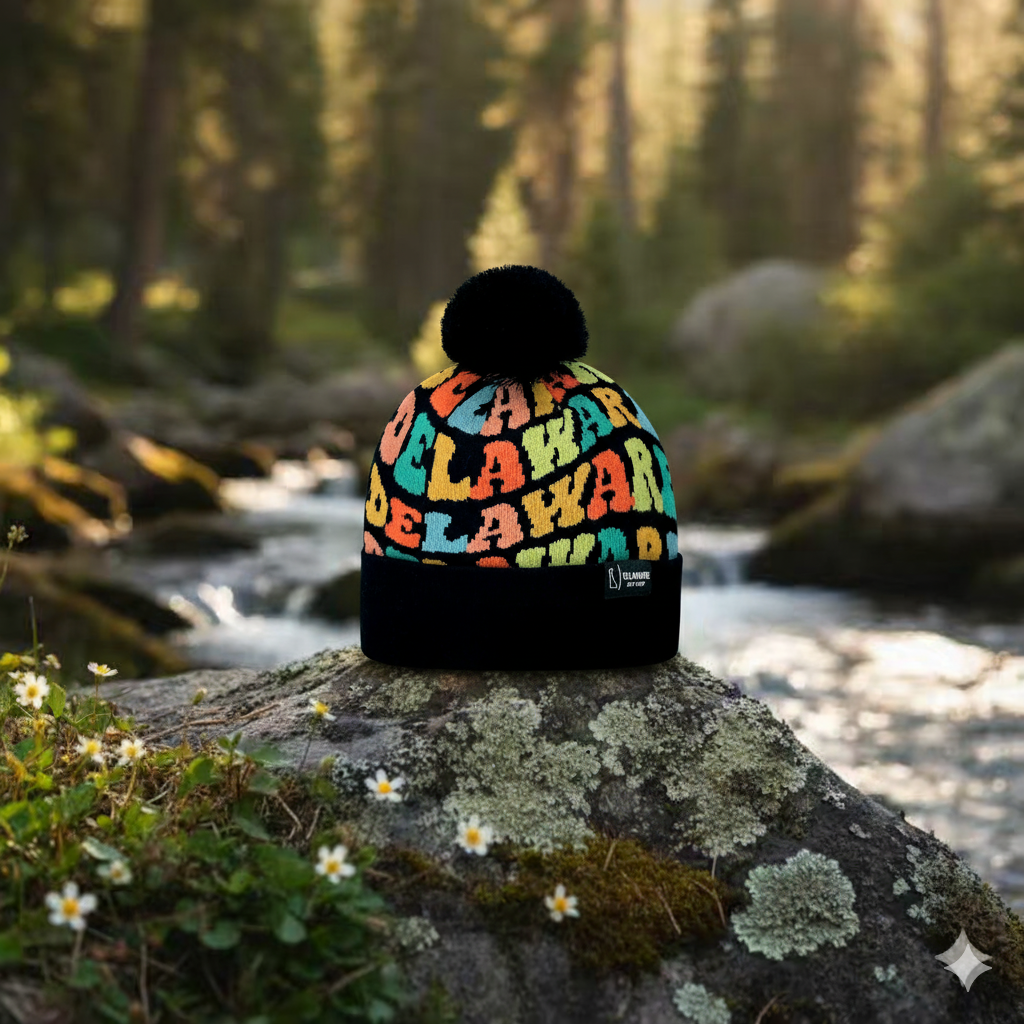 Add a pop of color and state pride to your winter style with this DELAWARE Colorful Knit Beanie with Pom Pom. Inspired by the cheerful coastal charm of Delaware, this beanie features bold “DELAWARE” lettering in retro-style typography. The mix of bright orange, teal, yellow, and coral tones stands out beautifully against the deep navy background, creating a fun and vibrant design that captures the state’s friendly and energetic character. A soft pom pom tops it off, bringing a cozy and playful finish to your look.
