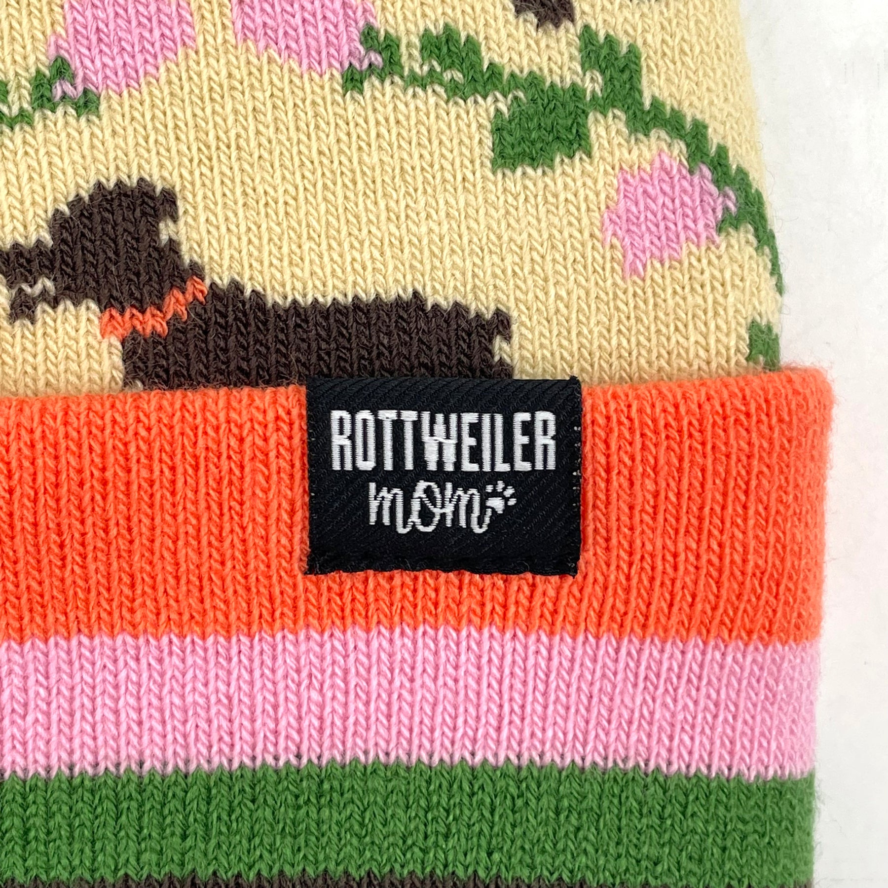 Stay warm and stylish this season with the Rottweiler Dog Knit Beanie with Pom Pom Winter Hat. This playful design showcases a repeating Rottweiler silhouette pattern across a soft yellow base, accented with colorful floral elements. A fold-over cuff in bold orange, green, pink, and brown stripes adds a vibrant touch, while the fluffy black pom pom on top completes the cozy look.
