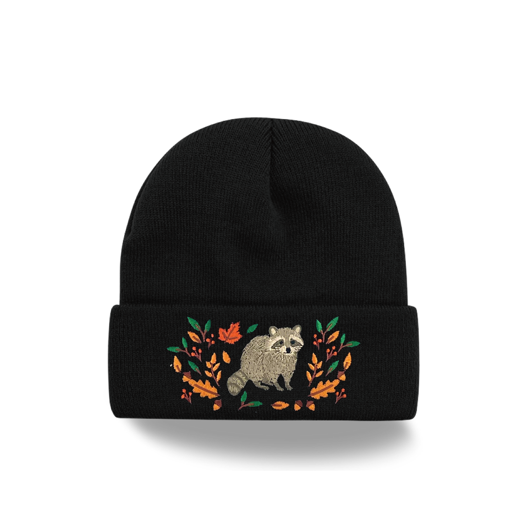 Raccoon Forest Embroidered Beanie – Cozy Knit Winter Hat with Autumn Leaves Design