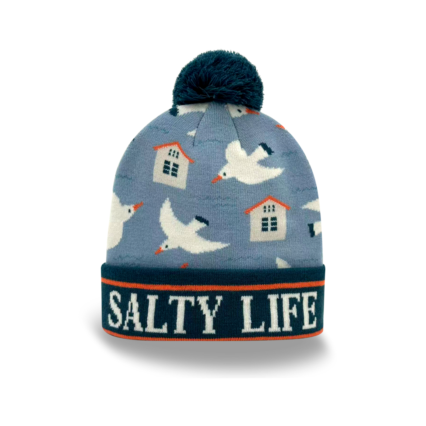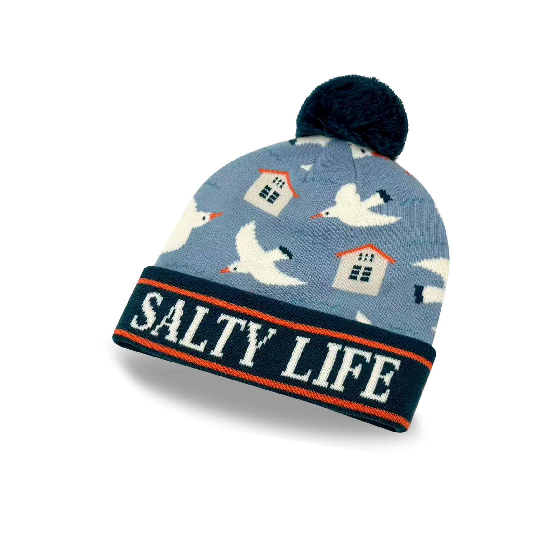 Salty Life Seagull & Beach House Knit Pom Pom Beanie – Coastal Winter Hat