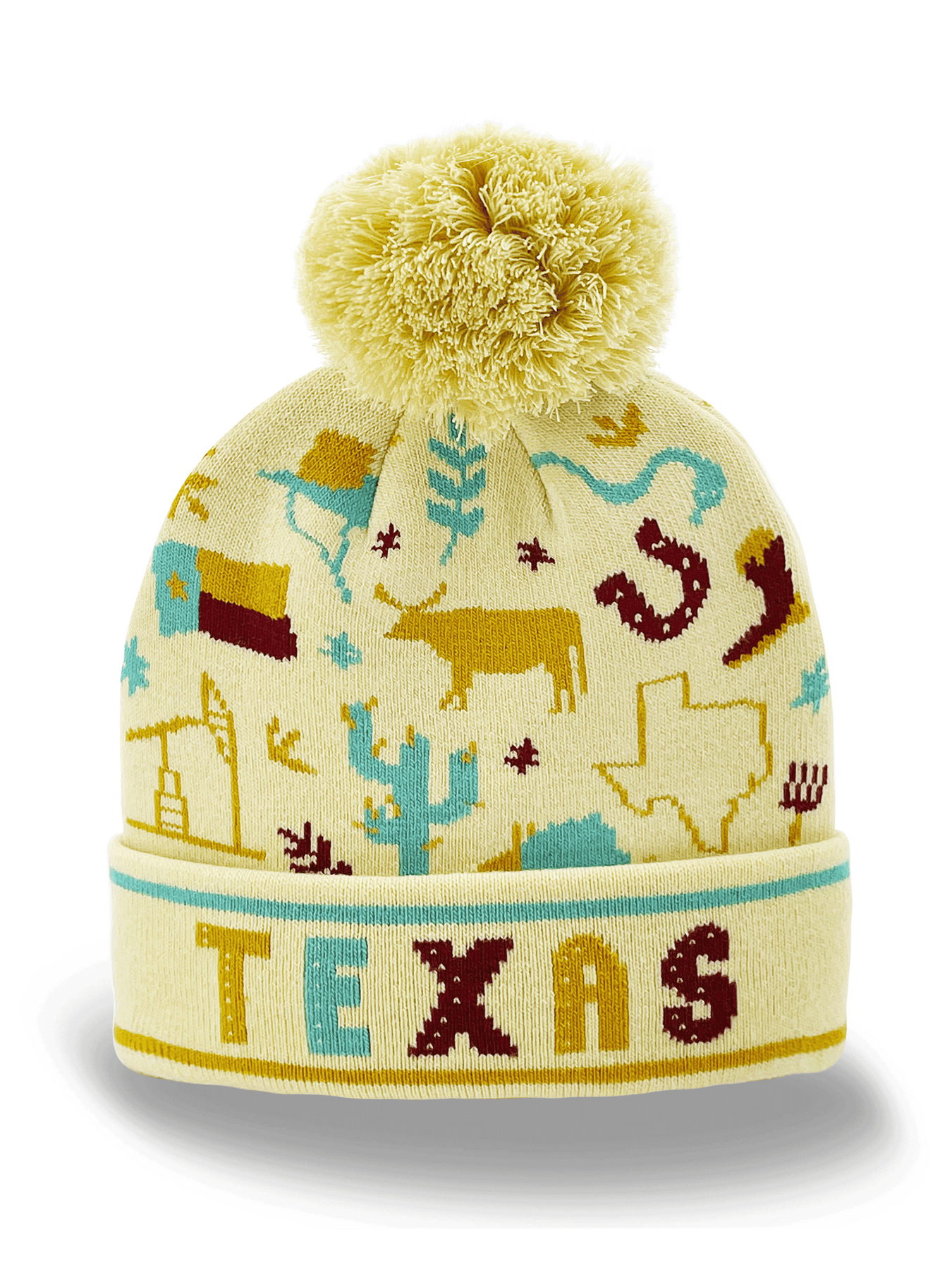 Texas Knit Beanie Hat with Cowboy Cactus Map Icons Winter Pom Pom Cap