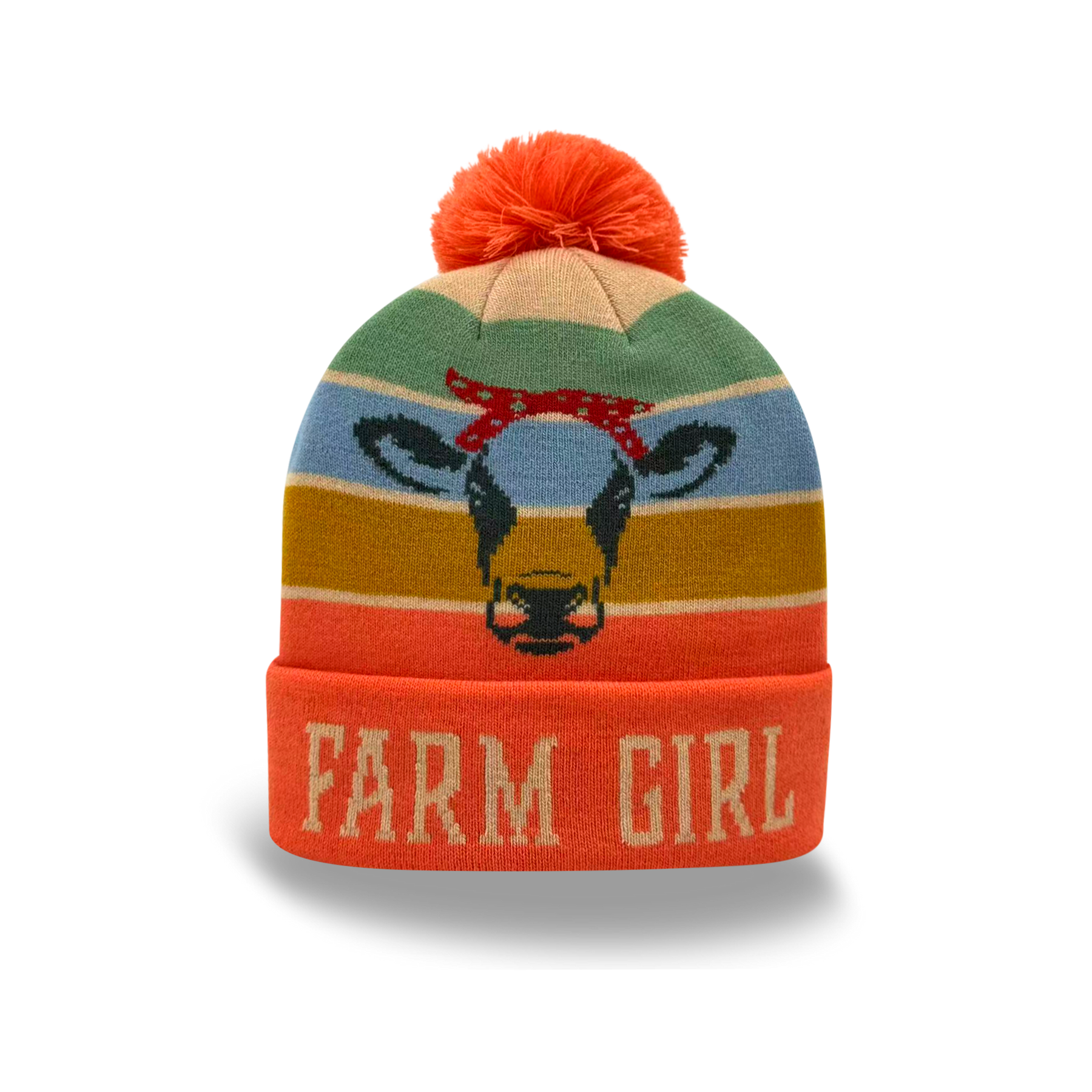 Add a touch of country charm to your winter look with the Farm Girl Cow Knit Pom Pom Beanie, inspired by the warmth and spirit of rural life. Featuring a friendly cow wearing a red polka-dot bandana, this beanie perfectly balances playful personality with rustic style. The colorful striped background in orange, mustard, and sage green evokes golden farm sunsets and cozy countryside afternoons, while the bold “FARM GIRL” lettering celebrates confidence and farm pride.