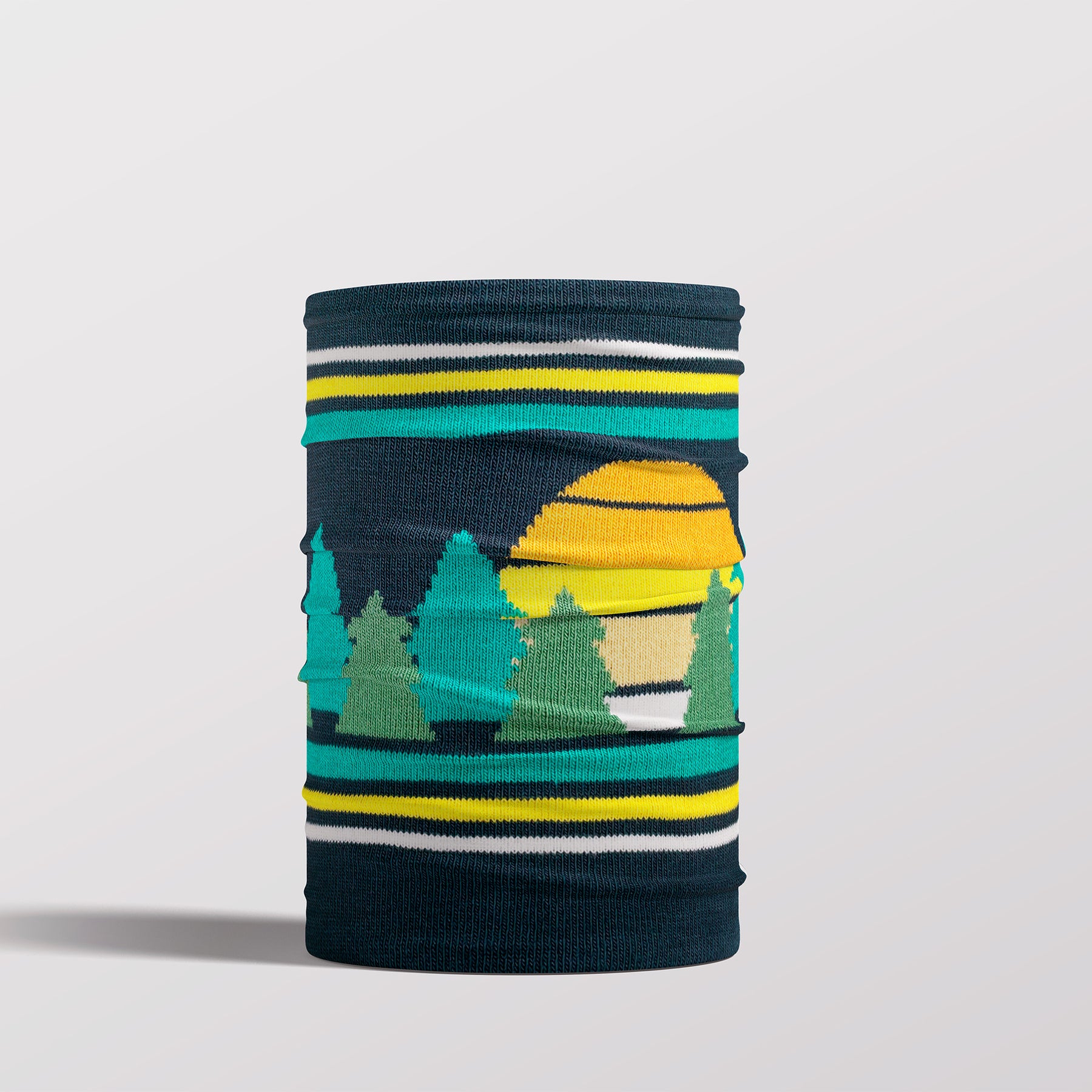 Immerse yourself in a peaceful forest at dawn, where towering pines stand silhouetted against a bright, golden sunrise. Shades of teal, green, and yellow offer a fresh take on the classic wilderness scene, evoking a sense of stillness and natural beauty.