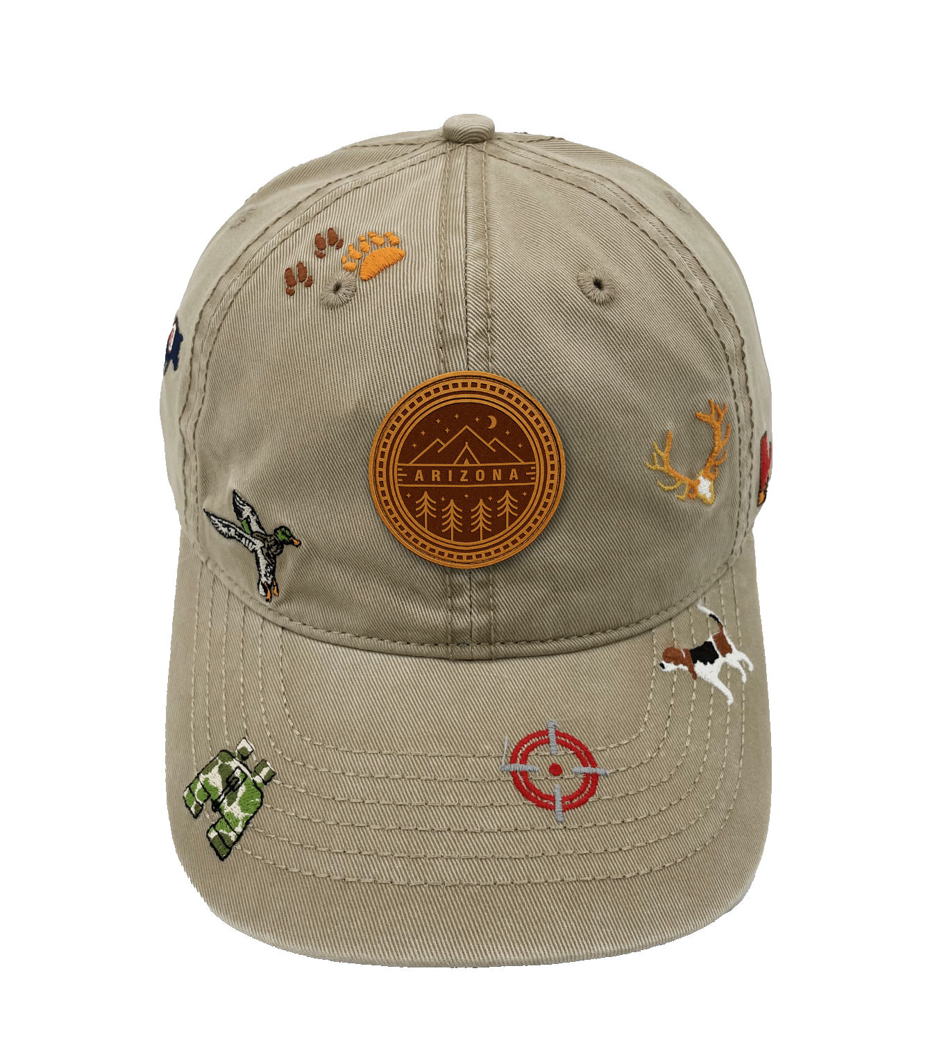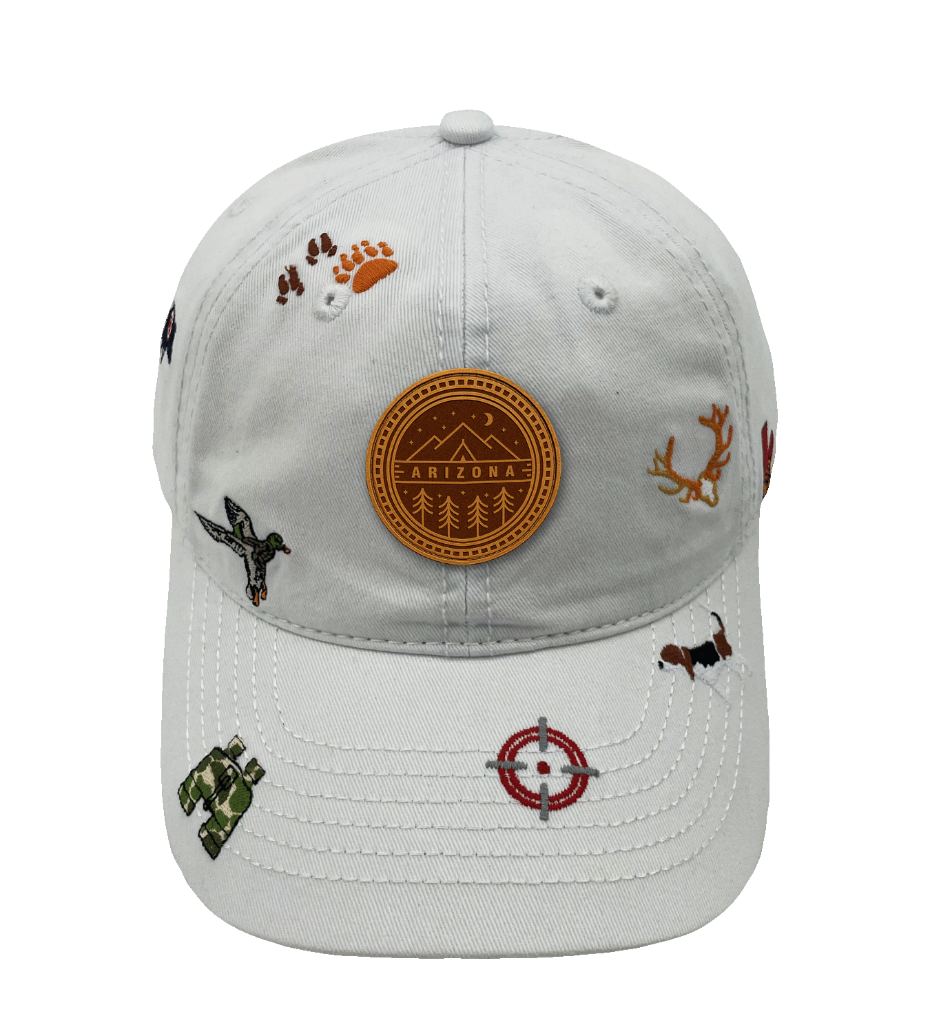 Add a wild hunting touch with this Arizona hunting baseball cap. Featuring embroidered details such as bear tracks, antlers, a hunting dog, duck, binoculars, and a target symbol, it captures the rugged spirit of Arizona’s outdoors. The central Arizona patch brings a bold identity, while the low-saturation base color design ensures versatility. Perfect for outdoor adventures, city outings, or casual everyday wear.