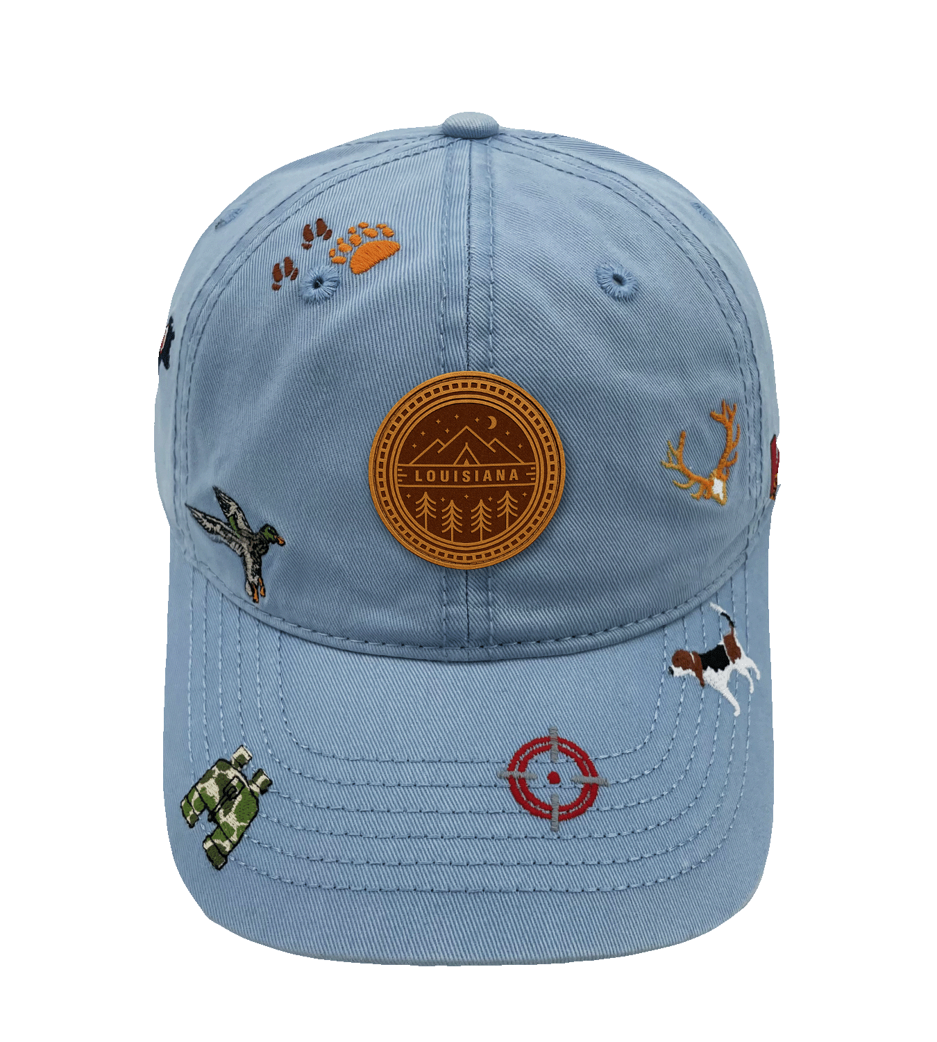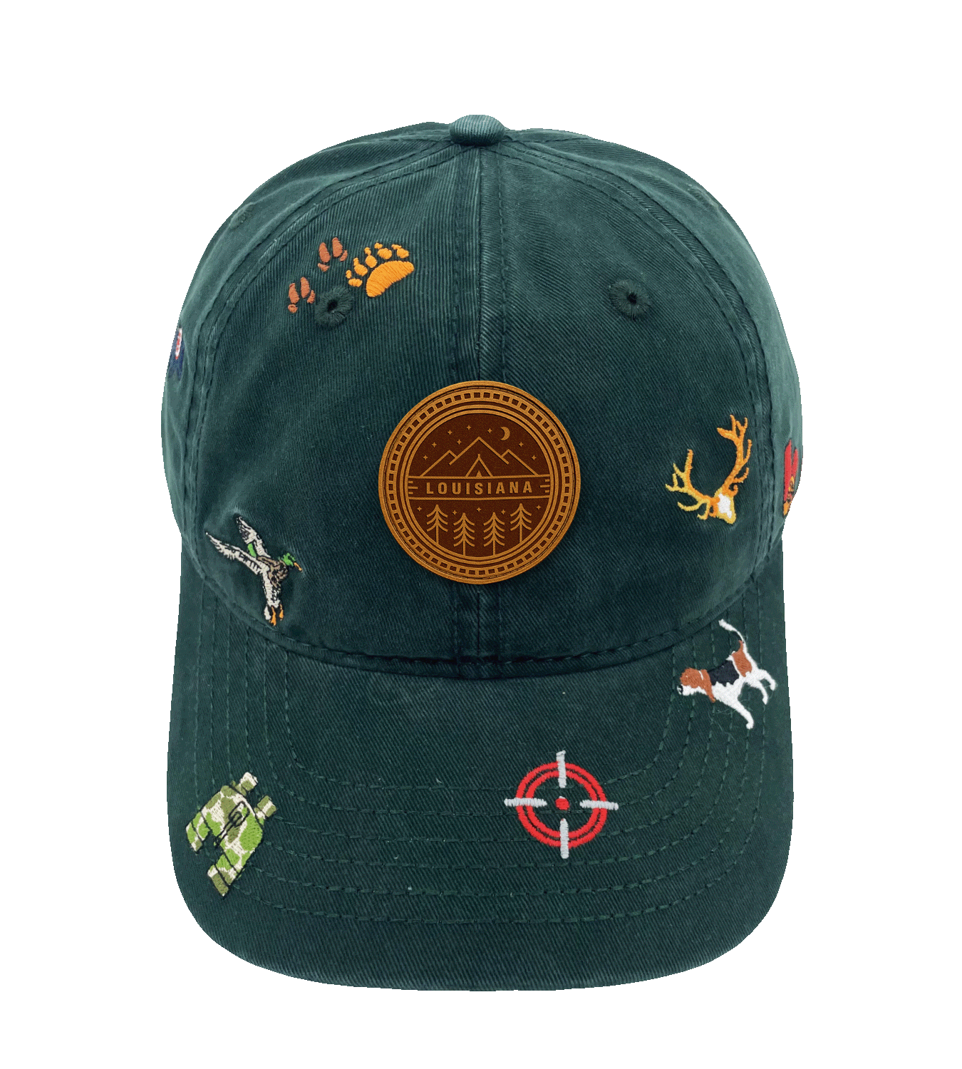Add a rugged hunting touch with this Louisiana Hunting Adventure Baseball Cap. Featuring embroidered motifs such as bear tracks, antlers, a hunting dog, duck, binoculars, and a target, it celebrates the outdoor hunting spirit of Louisiana. The central “LOUISIANA” patch adds bold identity, while the low-saturation base color design ensures versatility. Perfect for forest trails, hunting-inspired outfits, or casual everyday wear.