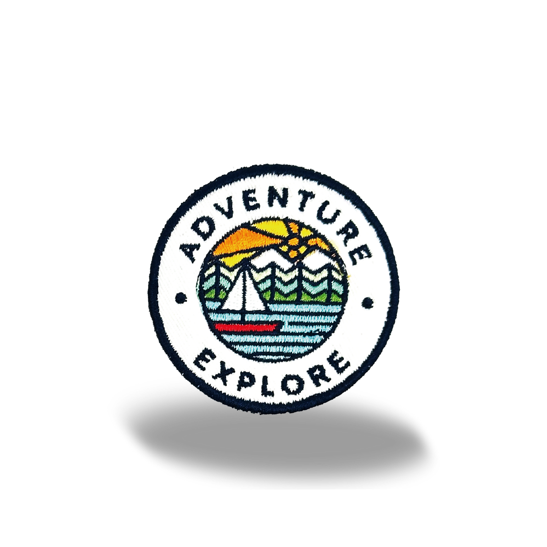 Adventure-Inspired Design — Embroidered patch featuring a sailboat, mountains, trees, and sun, symbolizing exploration and discovery.