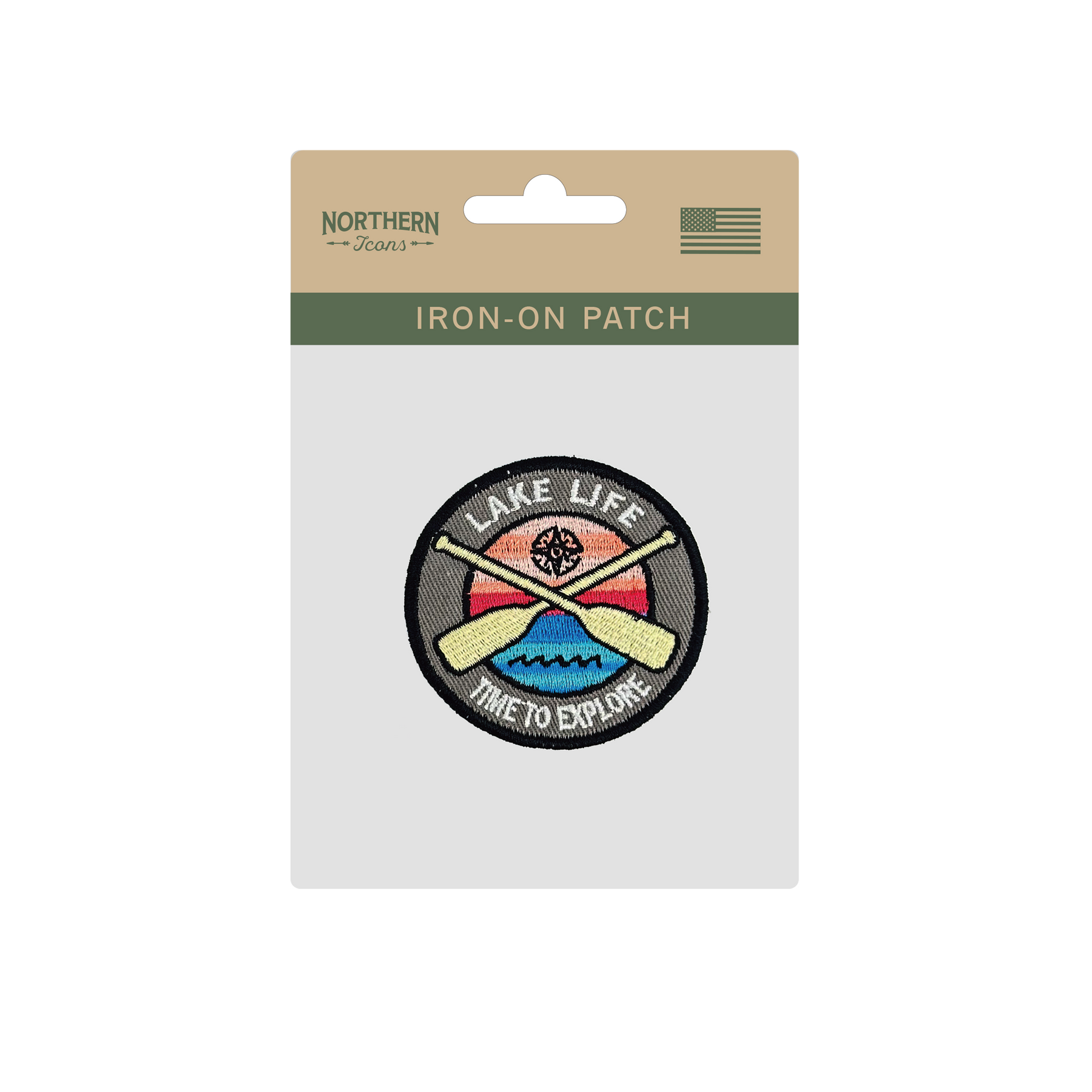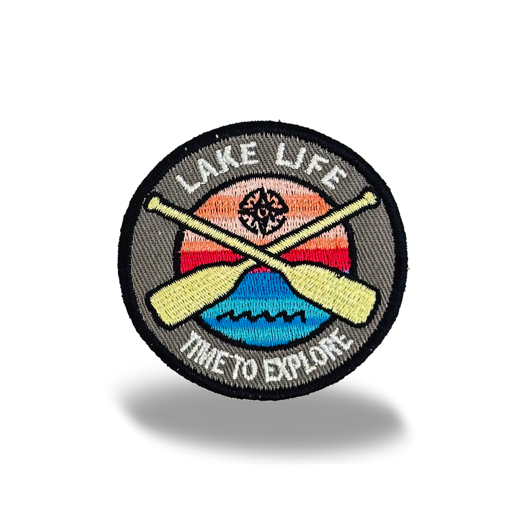• Exploration-Inspired Design — Embroidered patch with crossed paddles, compass, sunset, and waves, symbolizing adventure.