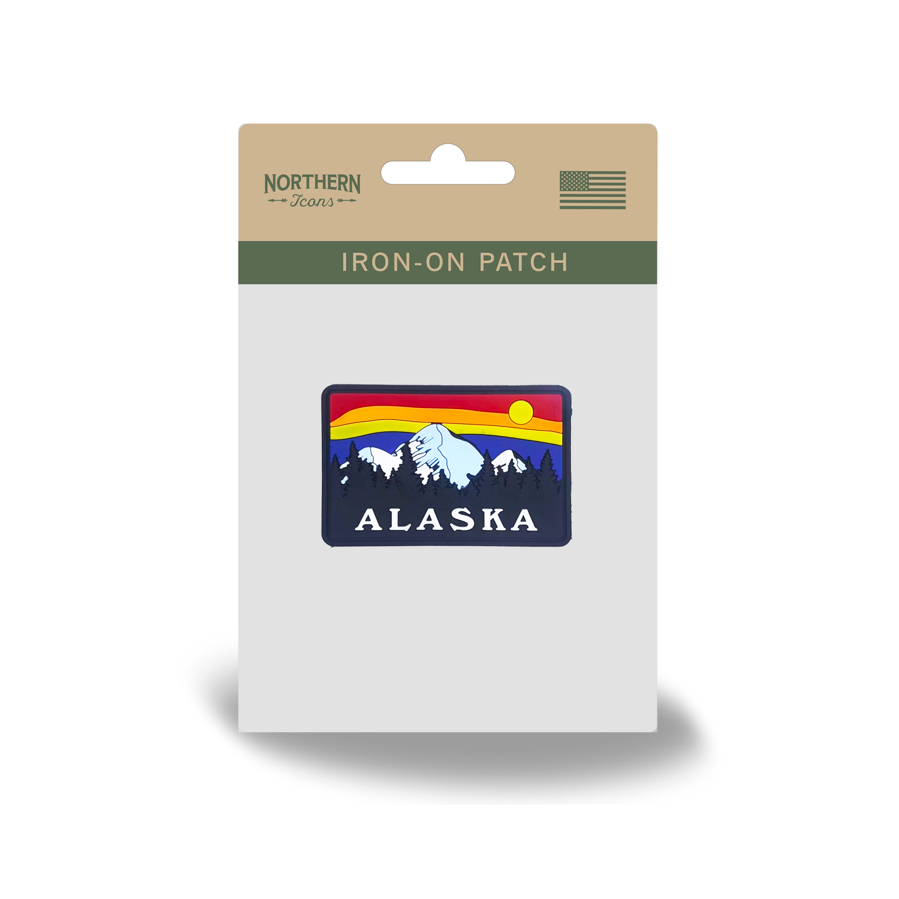 - Alaska Sunset Mountain Design – Snowy peaks, forest, and sunset in a bold scenic patch.