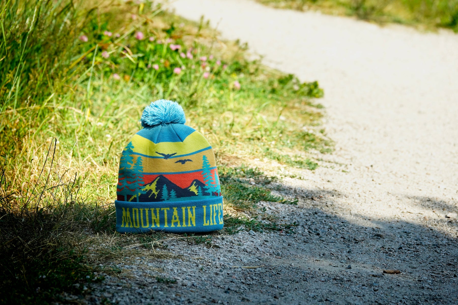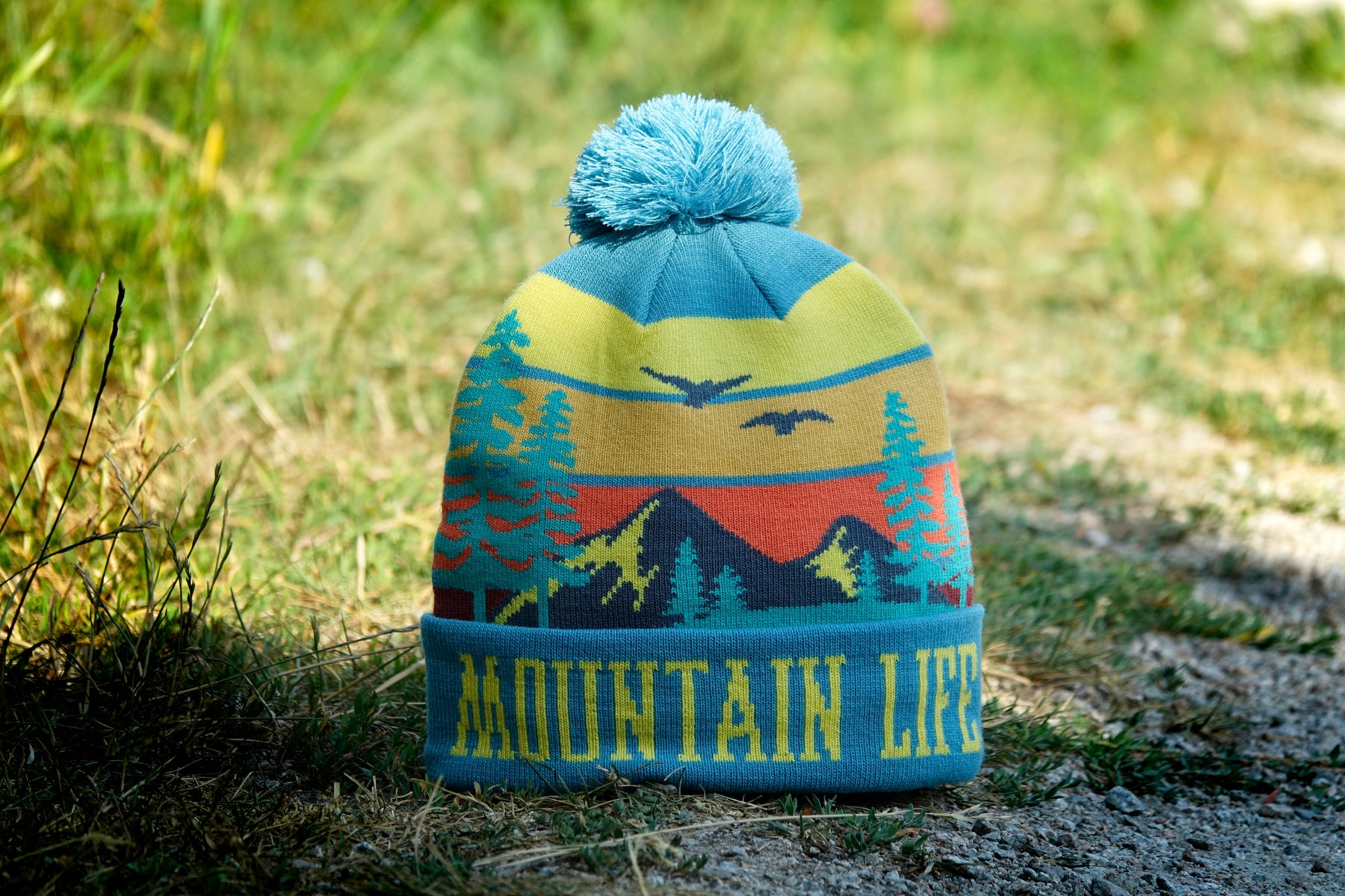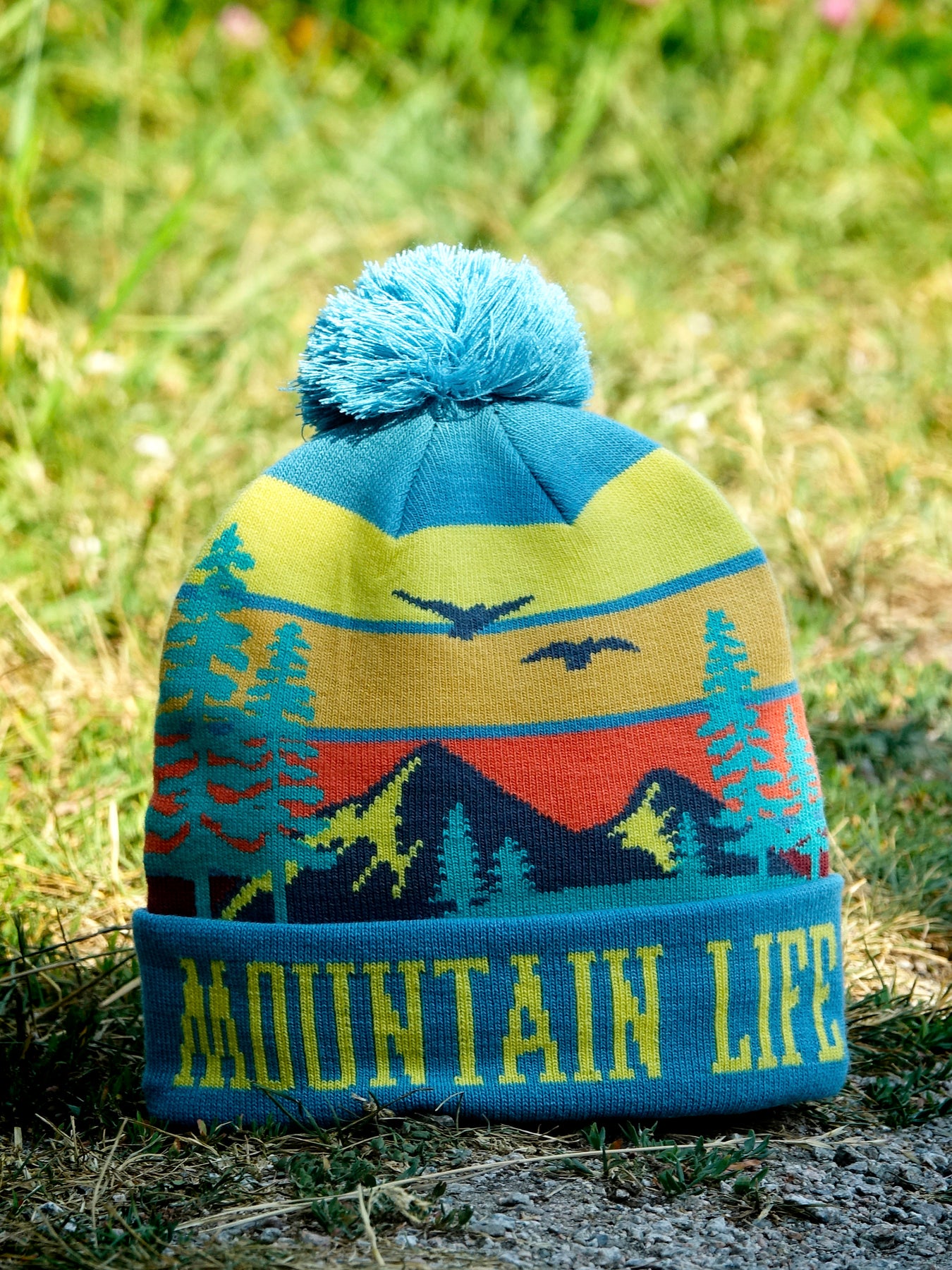 Mountain Life Knit Beanie Hat with Pom | Outdoor Hiking Camping Winter Adventure Cap