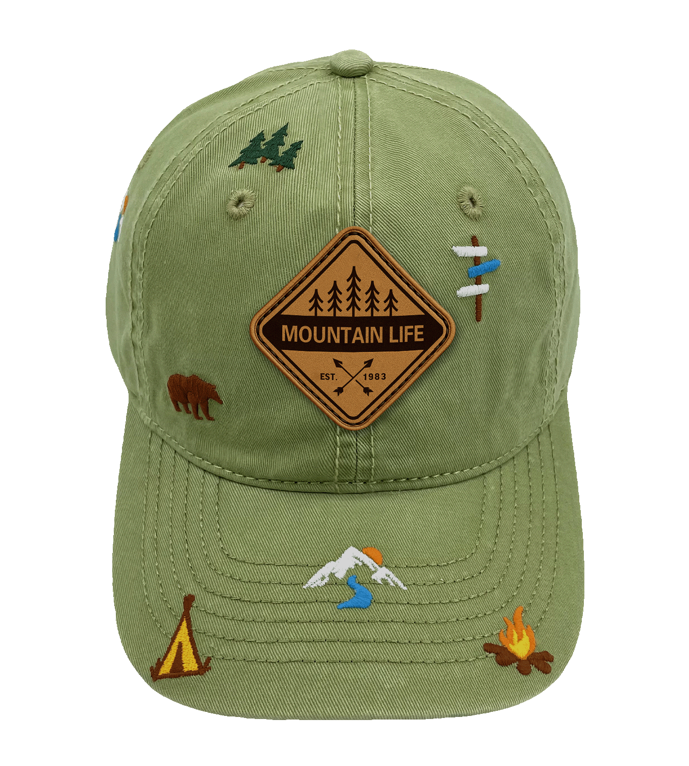 Live the mountain spirit every day with the Mountain Life Ridge Cap in rich maroon. Highlighted by a vintage faux leather patch reading “MOUNTAIN LIFE — Est. 1983,” this cap features finely embroidered icons celebrating the great outdoors — including a brown bear, pine trees, snowy peaks with a flowing river, trail markers, a campfire, and a tent.