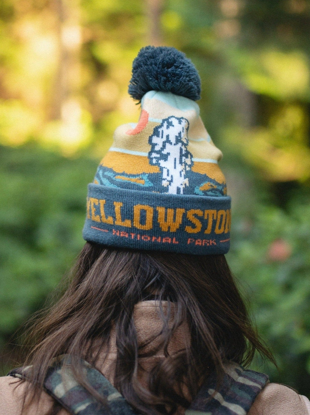 Yellowstone National Park Knit Beanie Hat with Pom Pom Winter Outdoor Geyser Design Cap
