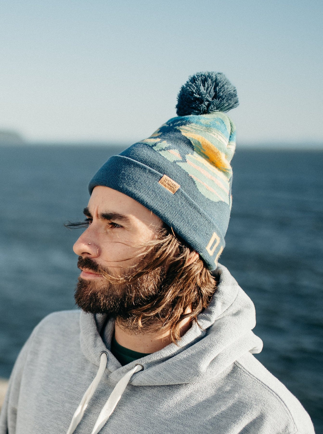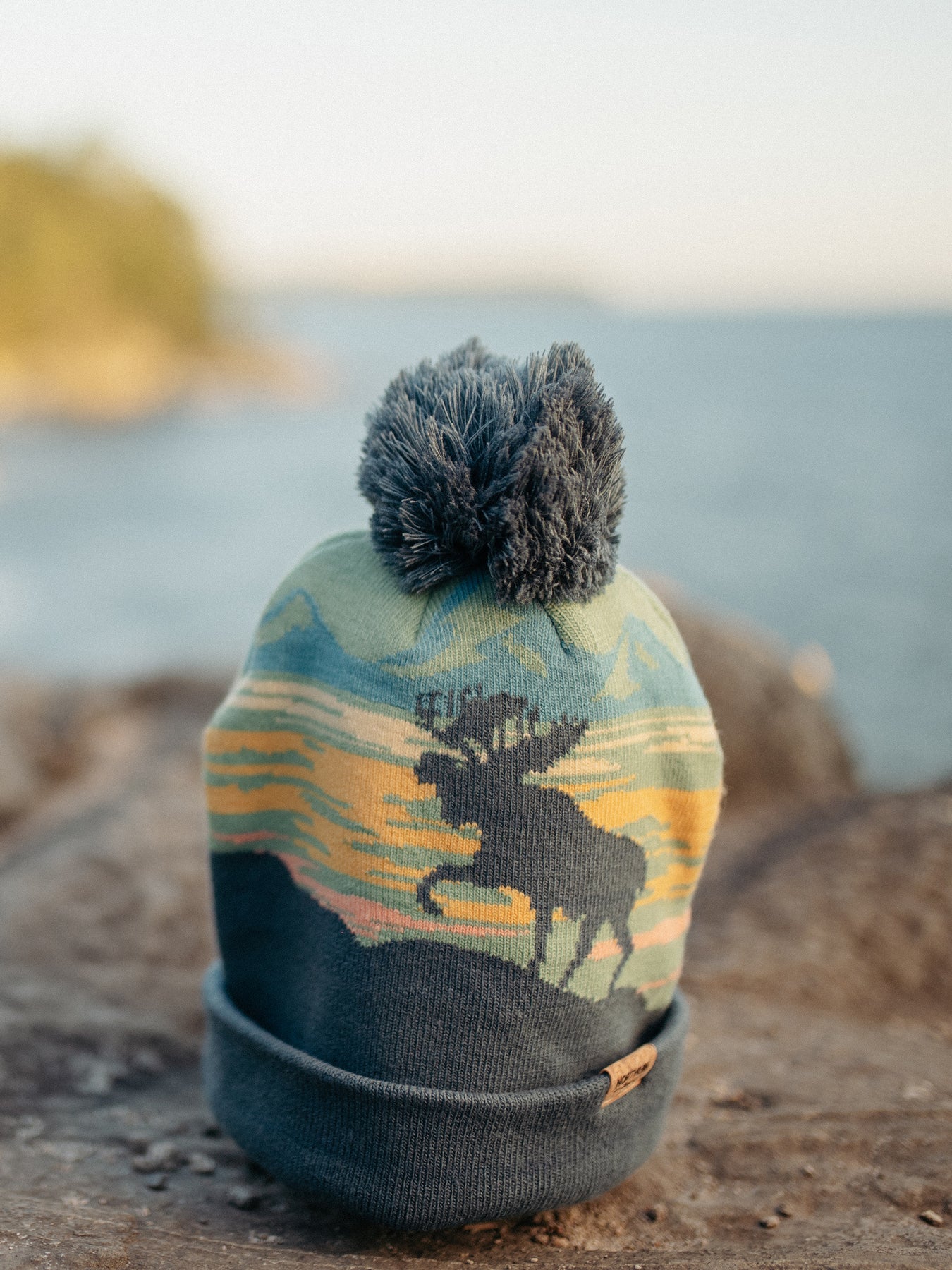 Embrace the majesty of Alaska with this Denali National Park Beanie with Pom Pom. Inspired by the towering peaks and wildlife of Denali, this design highlights a moose silhouette set against colorful skies and mountain ranges. The sunset-inspired hues and bold “Denali” lettering on the cuff create a striking balance of natural beauty and bold style, while the fluffy pom pom completes the cozy winter look.