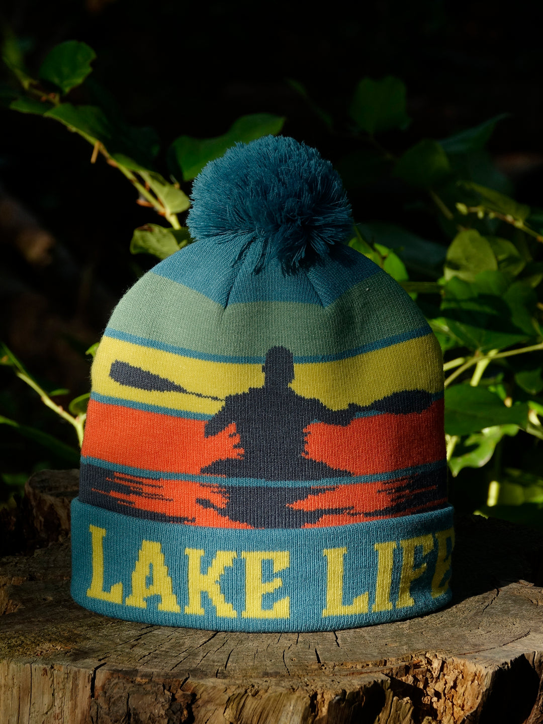 Lake Life Knit Beanie Hat with Pom | Winter Kayak Canoe Sunset Paddling Outdoor Cap