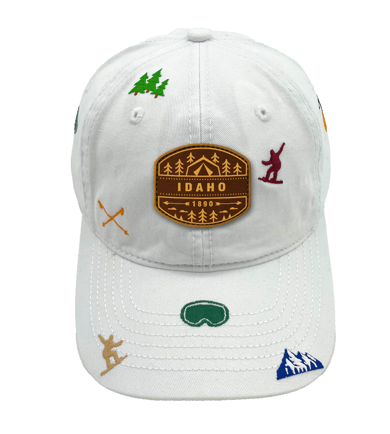 Add a touch of alpine spirit with the Idaho Ski Adventure Baseball Cap. Inspired by Idaho’s rugged mountain landscapes and skiing culture, the design features embroidered icons such as skiers, mountains, goggles, pine trees, and crossed ski poles. The central faux-leather patch highlights “IDAHO 1890,” celebrating the state’s heritage and its strong connection to outdoor adventure. The rich base color enhances the alpine theme, making it a standout accessory for winter outfits or casual wear. Perfect for ski lovers, outdoor explorers, and anyone who enjoys mountain-inspired style.