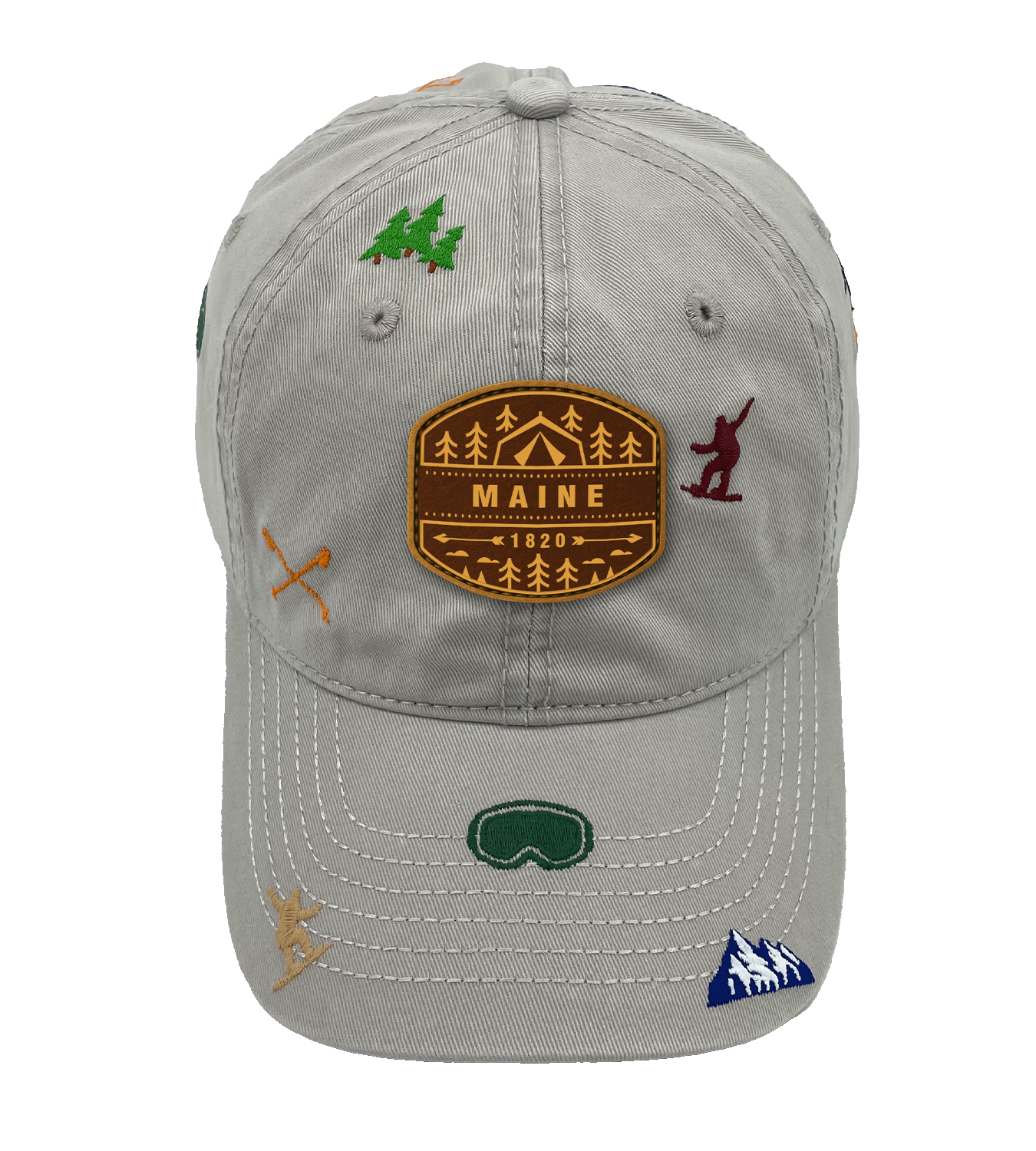 Add a touch of alpine adventure with the Maine Ski Adventure Baseball Cap. Inspired by Maine’s snowy slopes and rugged wilderness, the design showcases embroidered details such as skiers, mountains, goggles, pine trees, and crossed ski poles. The central faux-leather patch highlights “MAINE 1820,” celebrating the state’s heritage and long tradition of outdoor exploration. The rich base color enhances the alpine theme, making it a standout piece for both winter wear and casual outfits. Perfect for ski enthusiasts, travelers, and those who love mountain-inspired style.