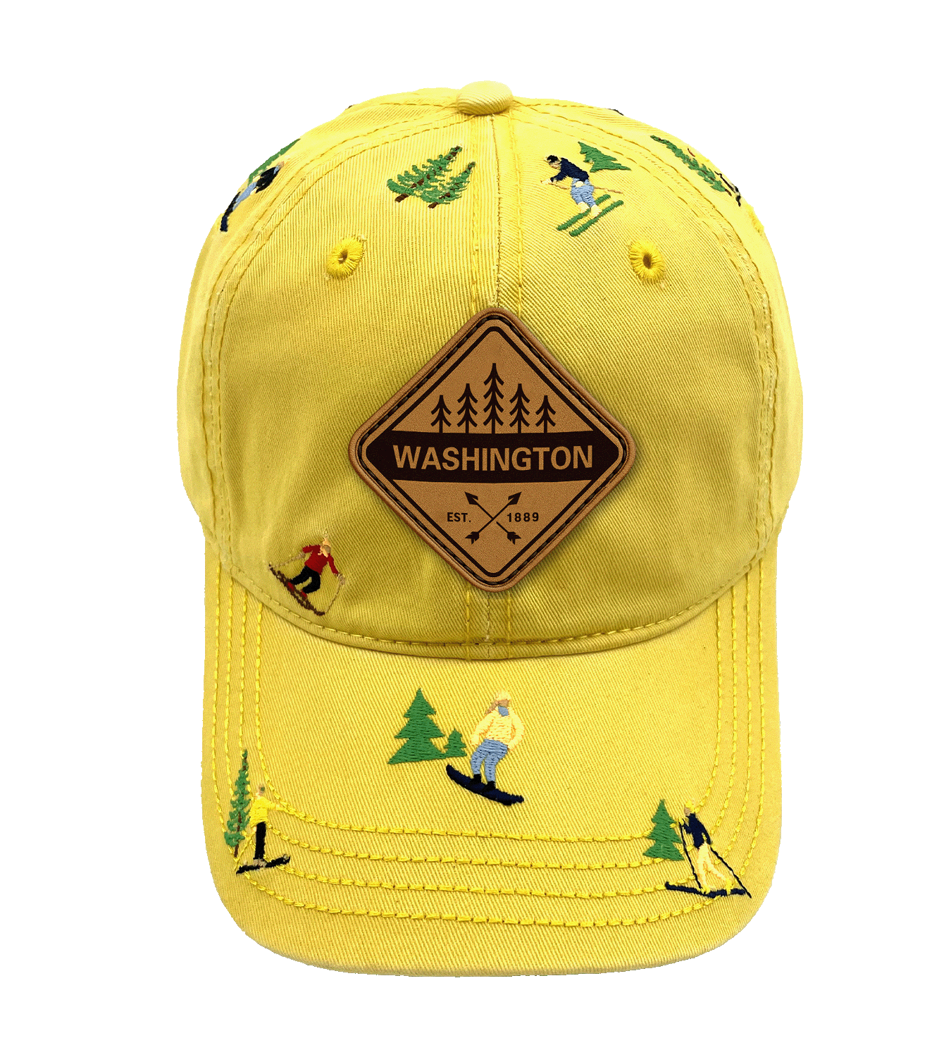 Add a Pacific Northwest vibe to your look with this Washington baseball cap. Designed with playful embroidery of skiers, snowboarders, and alpine pines, it reflects the adventurous lifestyle the state is known for. The bold Washington patch highlights its mountain culture, while the bright base color adds a modern touch, making it perfect for both outdoor trails and city streets.