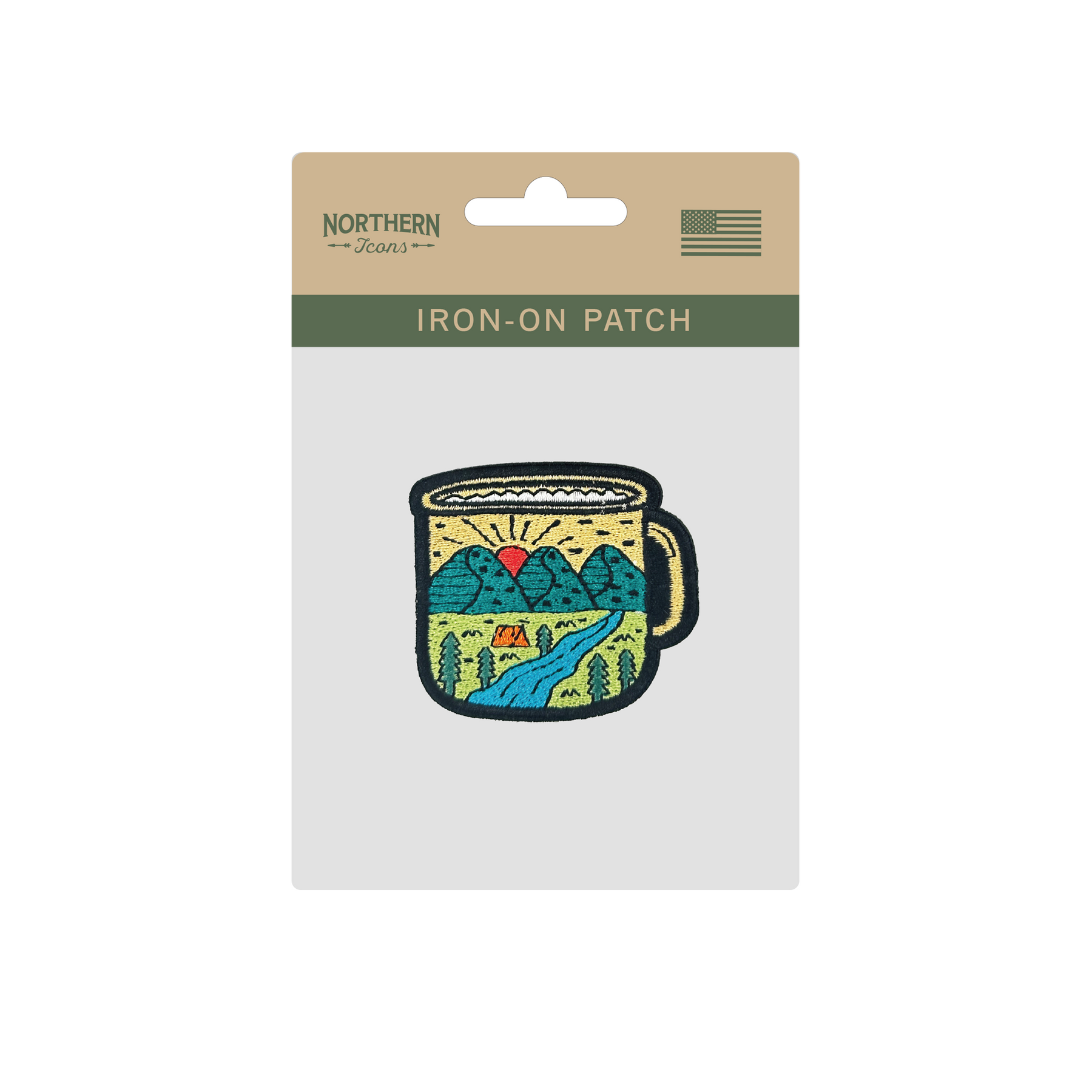 Inspired by the warmth of a campfire morning, this patch blends the imagery of a classic enamel mug with a breathtaking outdoor scene. Inside the mug design, mountains, trees, and a flowing river converge under the rising sun, creating a miniature world of adventure and peace. Perfect for adding a cozy yet adventurous vibe to jackets, backpacks, or hats.