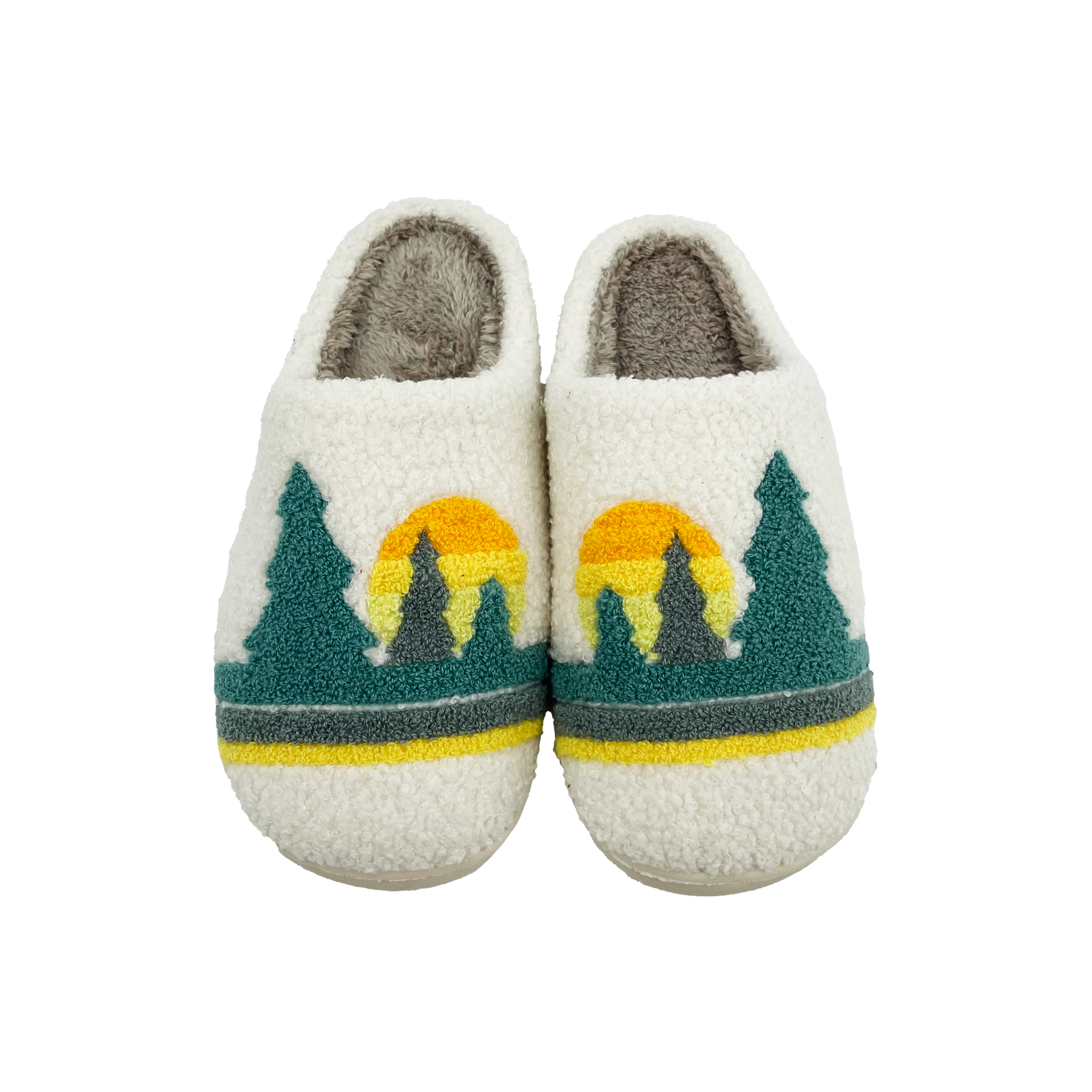 Step into the golden hour with the Twilight Grove Slippers. Featuring a charming scene of towering pines and a setting sun, this design captures the peaceful beauty of quiet forests bathed in evening light. Whether you're reminiscing about tranquil lakeside escapes or dreamy woodland strolls, these slippers bring a slice of nature's poetry to your everyday life.