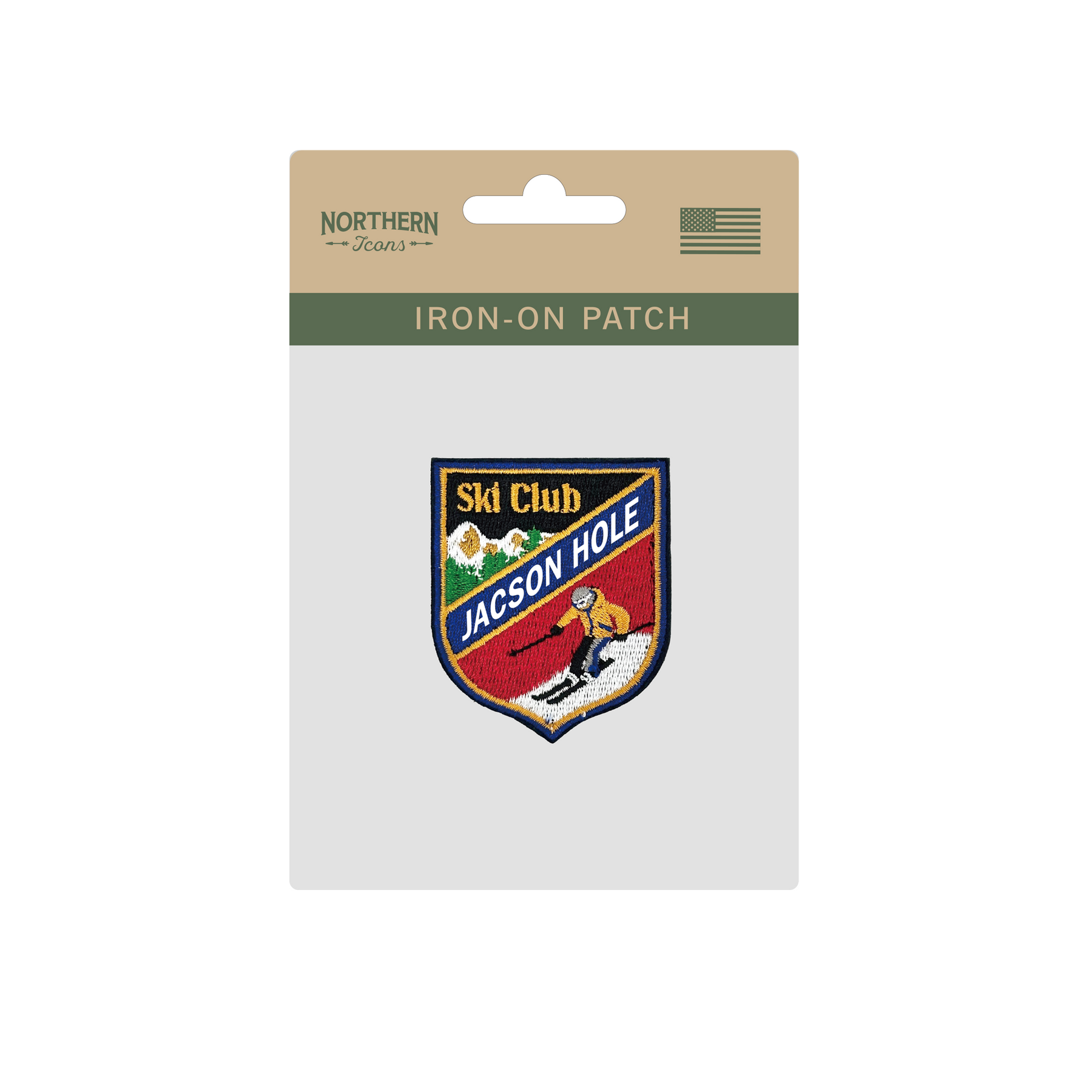 - Jackson Hole Ski Club Design – Shield-shaped patch with skier and mountain details for a sporty look.