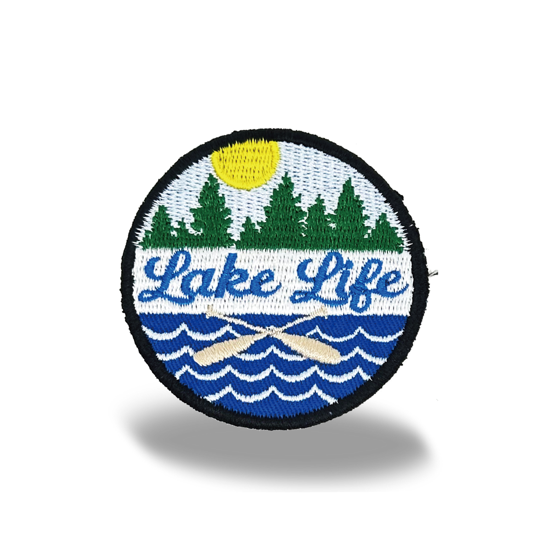 Capture the essence of lakeside living with this embroidered patch. Featuring a scenic design of pine trees, sunshine, waves, and crossed paddles, it reflects the spirit of outdoor adventure and tranquil waters. With an iron-on backing for quick application and the option to sew on for extra strength, this patch is perfect for jackets, backpacks, or outdoor accessories.