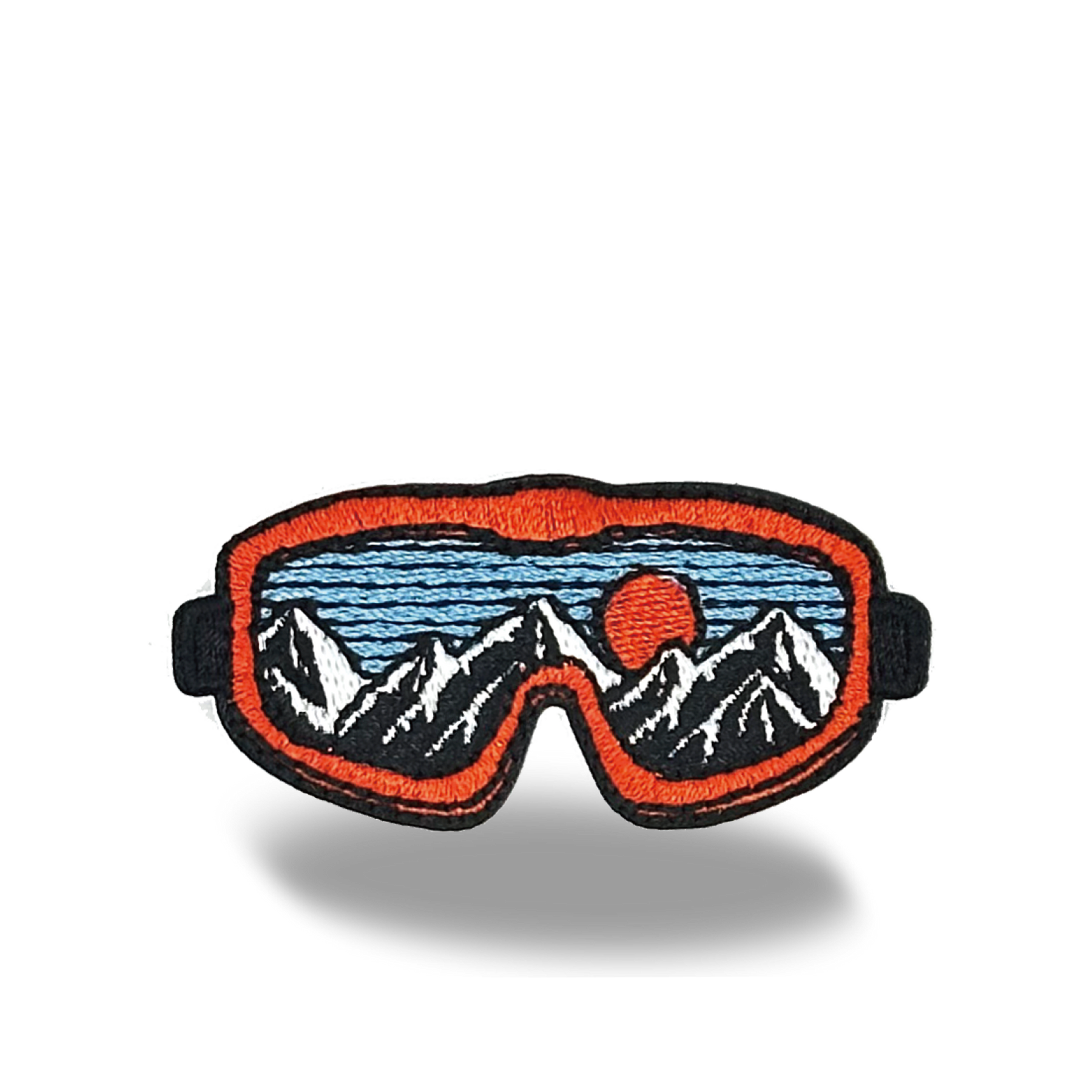 This patch features a unique goggle-shaped design capturing snow-capped peaks beneath a vivid sunset sky. The striking orange frame contrasts beautifully with the cool mountain blues, symbolizing the thrill of outdoor adventures and the breathtaking views seen through a skier’s or hiker’s lens. With its iron-on backing, it’s perfect for jackets, backpacks, or gear, adding a bold alpine-inspired accent.