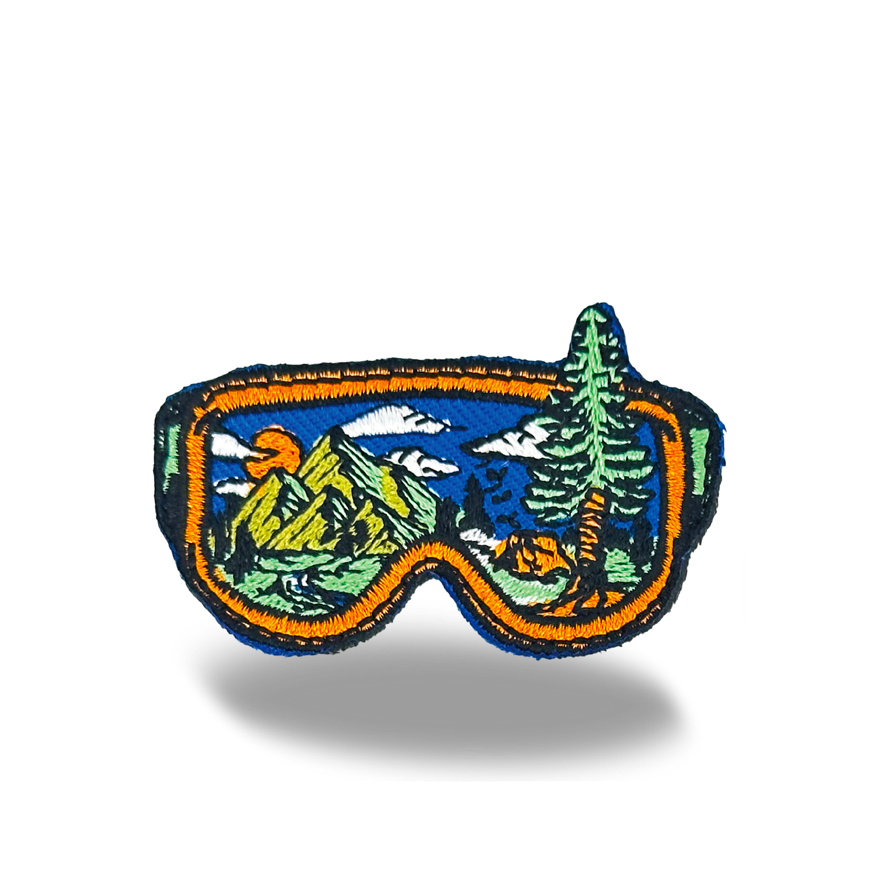 This embroidered patch creatively combines ski goggles with a stunning mountain landscape, capturing the spirit of outdoor sports and exploration. The design shows snowy peaks, forests, and a bright sky, symbolizing adventure and freedom. Perfect for decorating jackets, backpacks, or gear for those who love skiing, hiking, and mountain life.