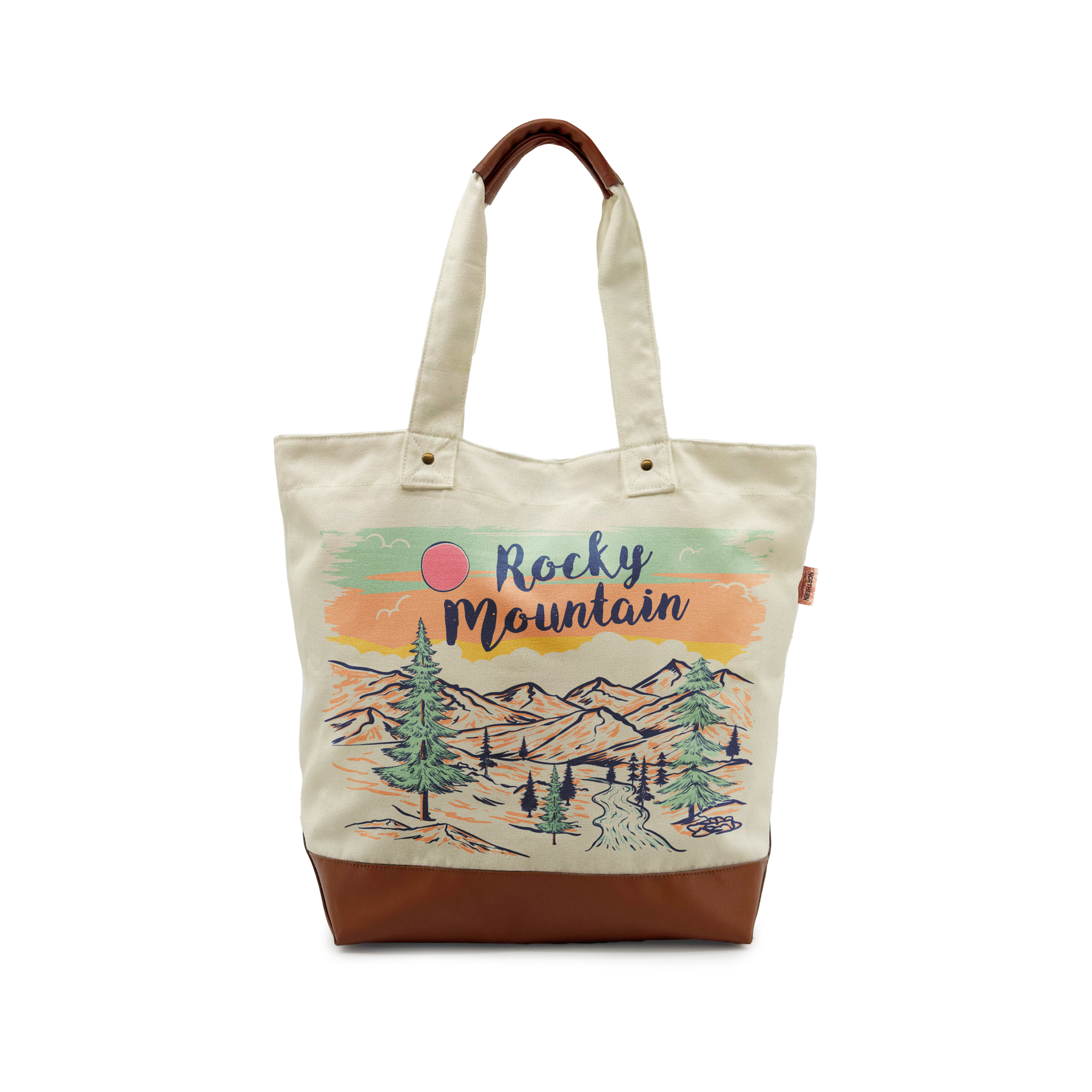 This tote embodies the quiet elegance of the Rocky Mountains. With a minimalist illustration featuring soft pastel skies, gentle rolling peaks, and iconic pine trees, it captures the refined beauty of nature in its purest form. The design speaks to those who appreciate understated sophistication and timeless landscapes.