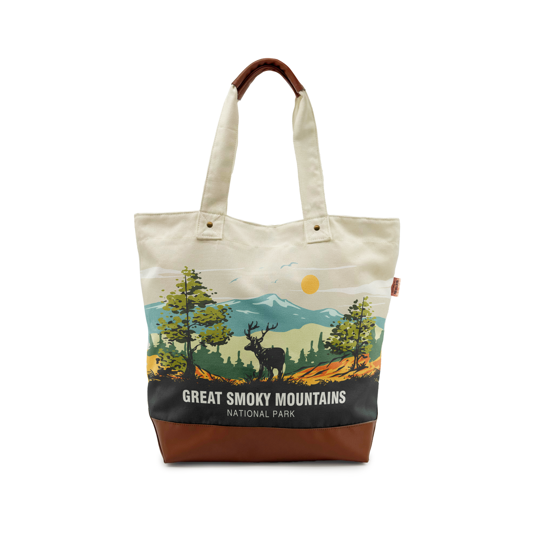 Inspired by the breathtaking beauty of Great Smoky Mountains National Park, this tote brings the wild to your side. Featuring a serene forest scene, rolling mountain peaks, and a majestic deer enjoying the sunrise, this design captures the peaceful charm of America’s most-visited national park. Whether you're strolling through Cades Cove or just dreaming of fresh mountain air, this tote brings a little Smokies magic everywhere you go.