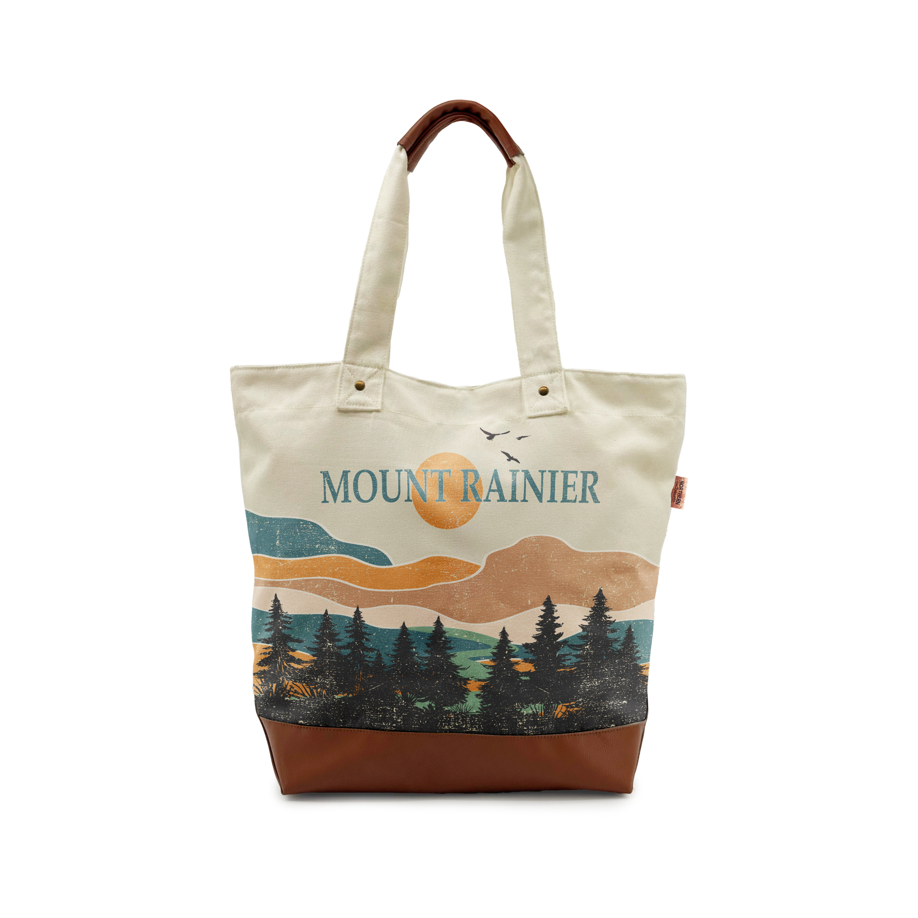 Inspired by the breathtaking views of Mount Rainier National Park, this tote captures the serene beauty of the Pacific Northwest. With a design featuring rolling hills, soaring birds, and a tranquil sunset behind evergreen forests, it reflects the iconic landscapes that make Mount Rainier a dream destination for outdoor enthusiasts. Whether you've hiked its trails or simply admire its natural wonder, this bag brings a piece of Rainier's magic into your everyday life.